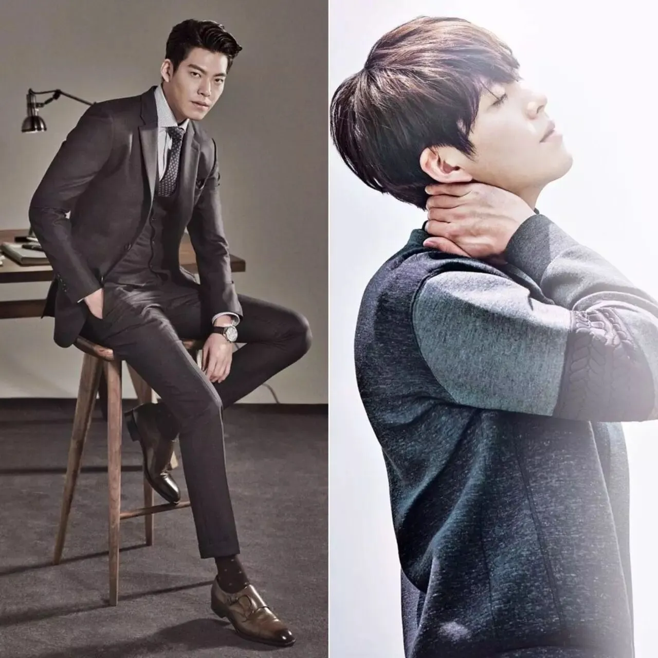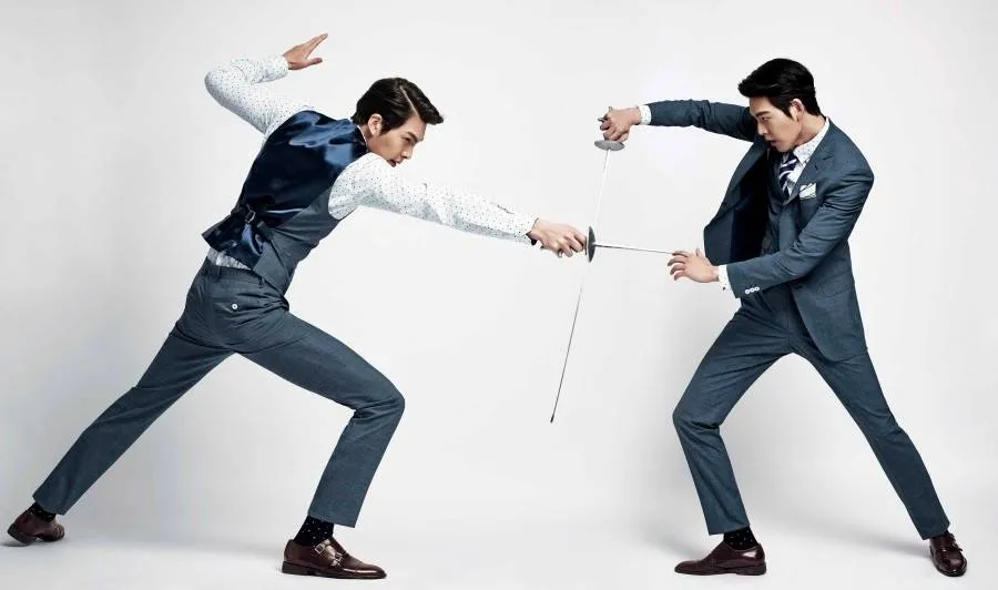 像是那组以击剑为主题的大片,身着西装马甲的金宇彬对阵三件套齐备的自己,一个休闲优雅,一个商务精英,两种风格动静皆宜。