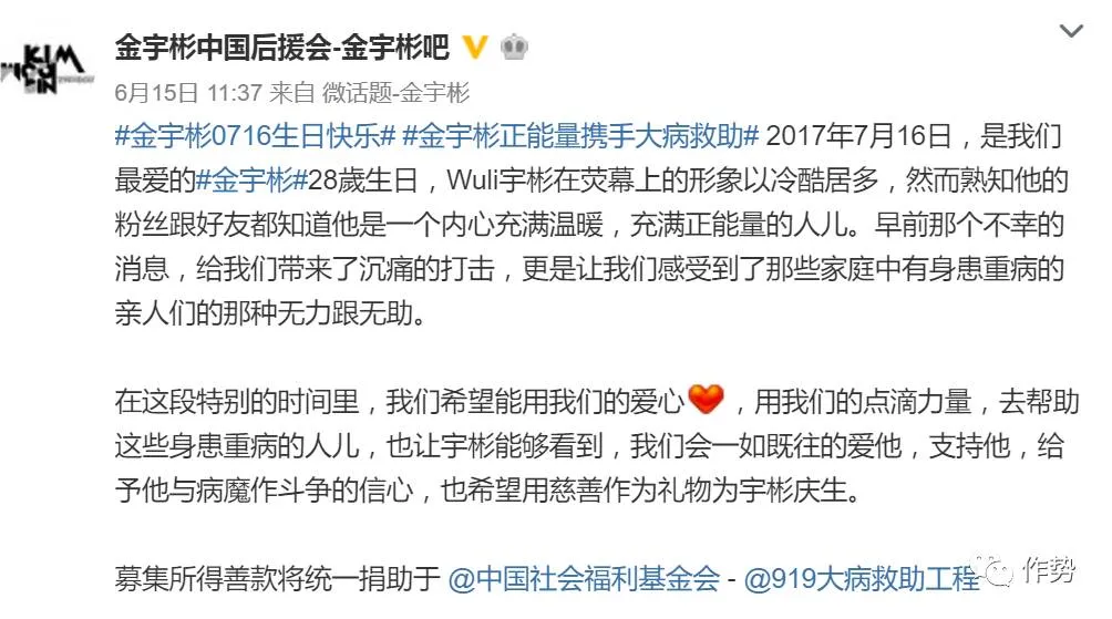 他的中国后援会,前段时间也在网上号召彼此募款——但不是为远在他乡的金宇彬本人,而是通过慈善组织捐款给中国国内同样罹患重病的人们,用力所能及的正向力量来传递对金宇彬的祝福。