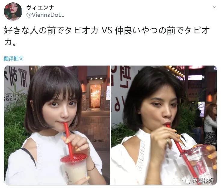 你可能有印象的“在喜欢的人面前喝奶茶VS在熟人朋友面前喝奶茶”的对比图,主角就是她本人