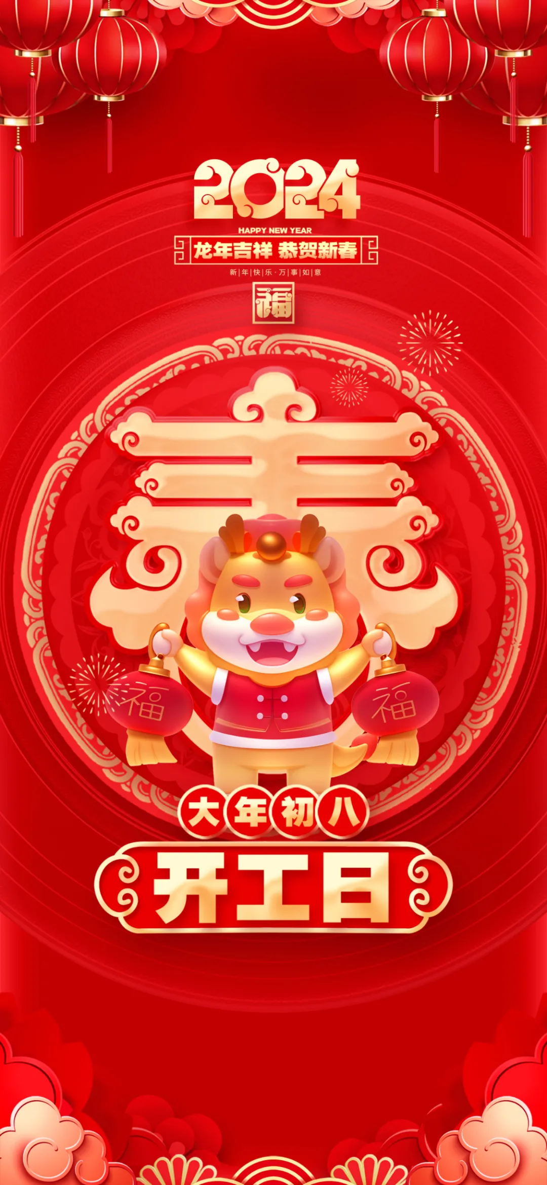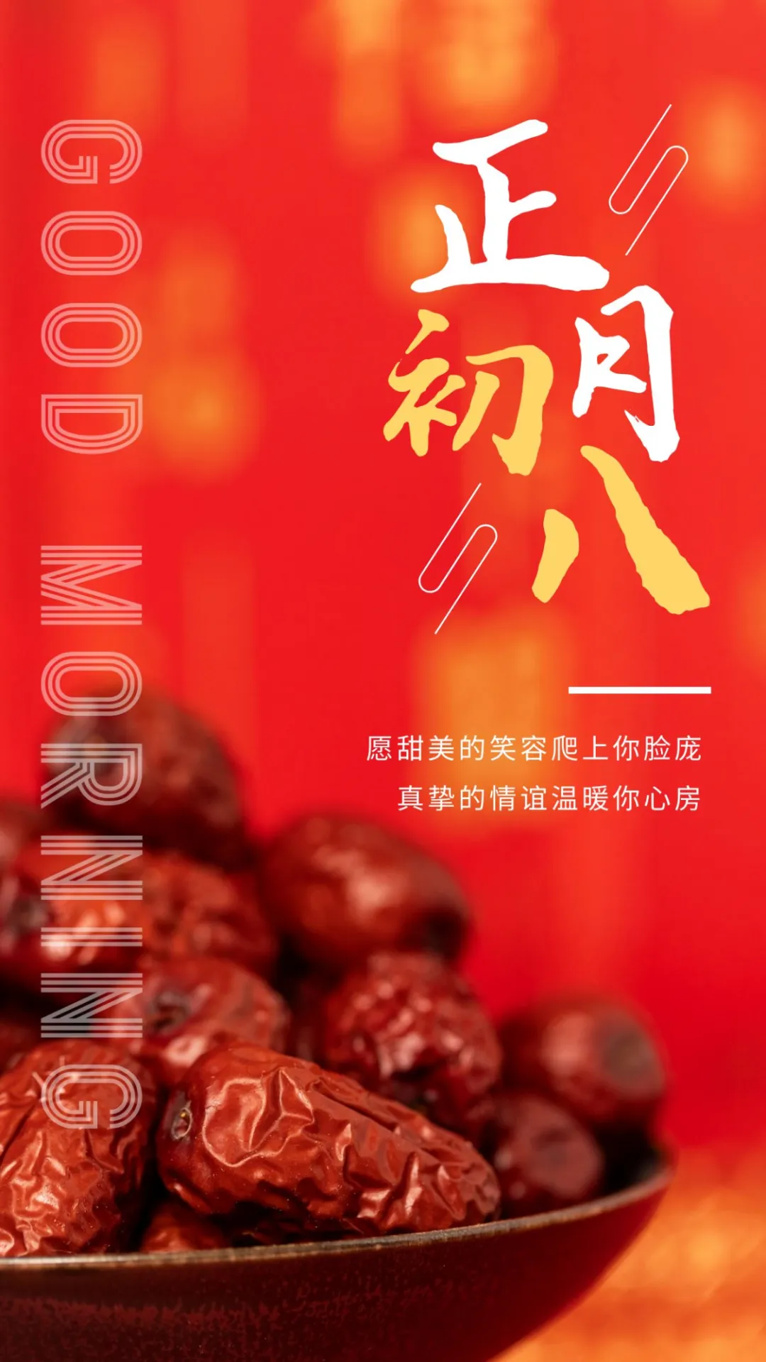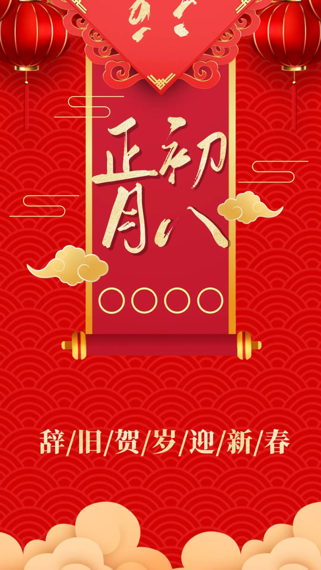 正月初八:八方来财,八方来喜,八方来福。祝您:事业,八方支援;处世,八面玲珑;智慧,八斗之才;烦恼,八百孤寒;人生,八面威风;朋友,八拜之交。龙年财源滚滚,一发到家!