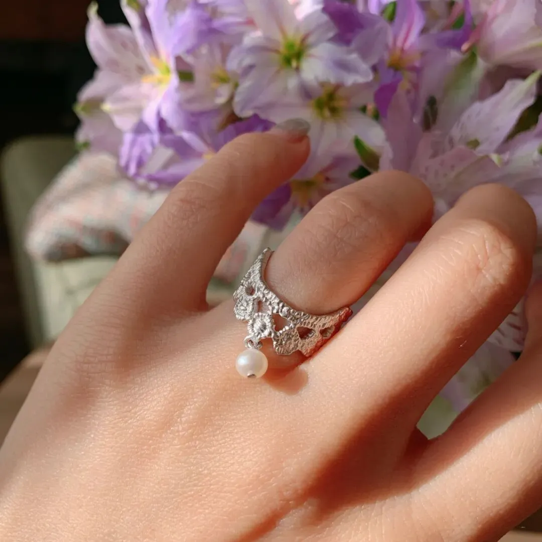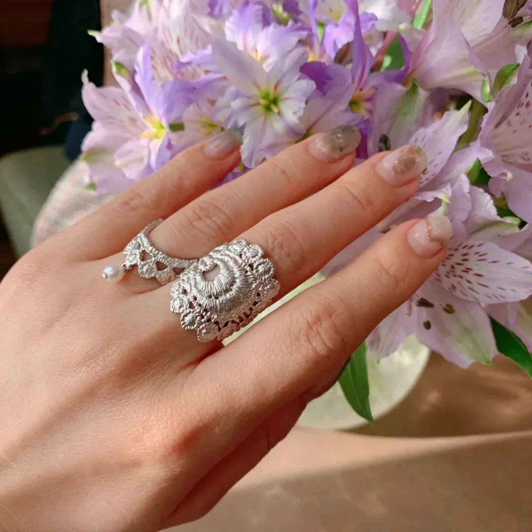 蕾丝戒指分大小两款,小蕾丝上坠着的珍珠是天然淡水珠,倒U型设计能在视觉上起到拉长手指的神奇效果。