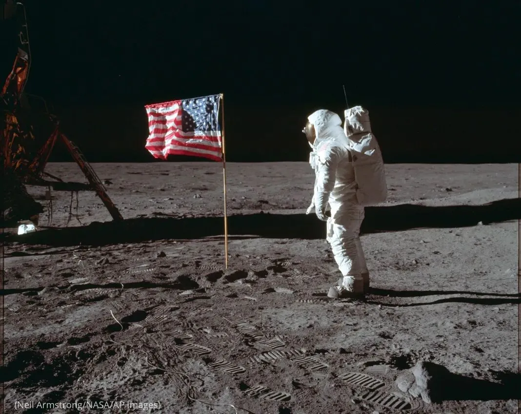 1969年7月20日,执行“阿波罗11号”登月使命的NASA宇航员巴兹·奥尔德林在月球上的美国国旗旁留影。(Neil Armstrong/NASA/AP Images)