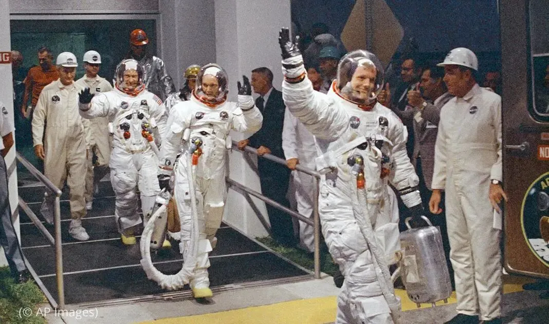 1969年7月16日在位于佛罗里达州梅里特岛(Merritt Island, Florida)的肯尼迪太空中心(Kennedy Space Center),尼尔·阿姆斯特朗,前排挥手者,与同事即将乘车前往火箭发射场,开始登月旅程。(© AP Images)