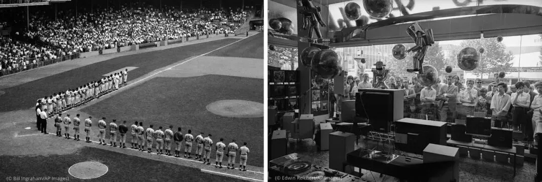 右:1969年7月16日在德国,柏林人站在电视商店前观看“阿波罗11号”太空使命转播。(© Edwin Reichert/AP Images)