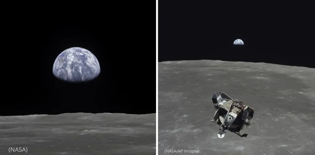 左:1969年7月20日从环绕轨道的指令舱拍摄的地球从月球地平线生起。这是航天项目拍下的最著名景像之一,不过宇航员记不清谁是具体拍照人。(NASA)