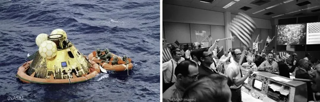 左:世界标准时间1969年7月24日16时50分,登月舱在夏威夷(Hawaii)西南1504公里处落入水中,身穿生物隔离服的三名宇航员与一名海军蛙人在等待直升机接应,他们将被送往美国“大黄蜂号”(USS Hornet)航空母舰。宇航员随后接受三个星期的隔离。(NASA)