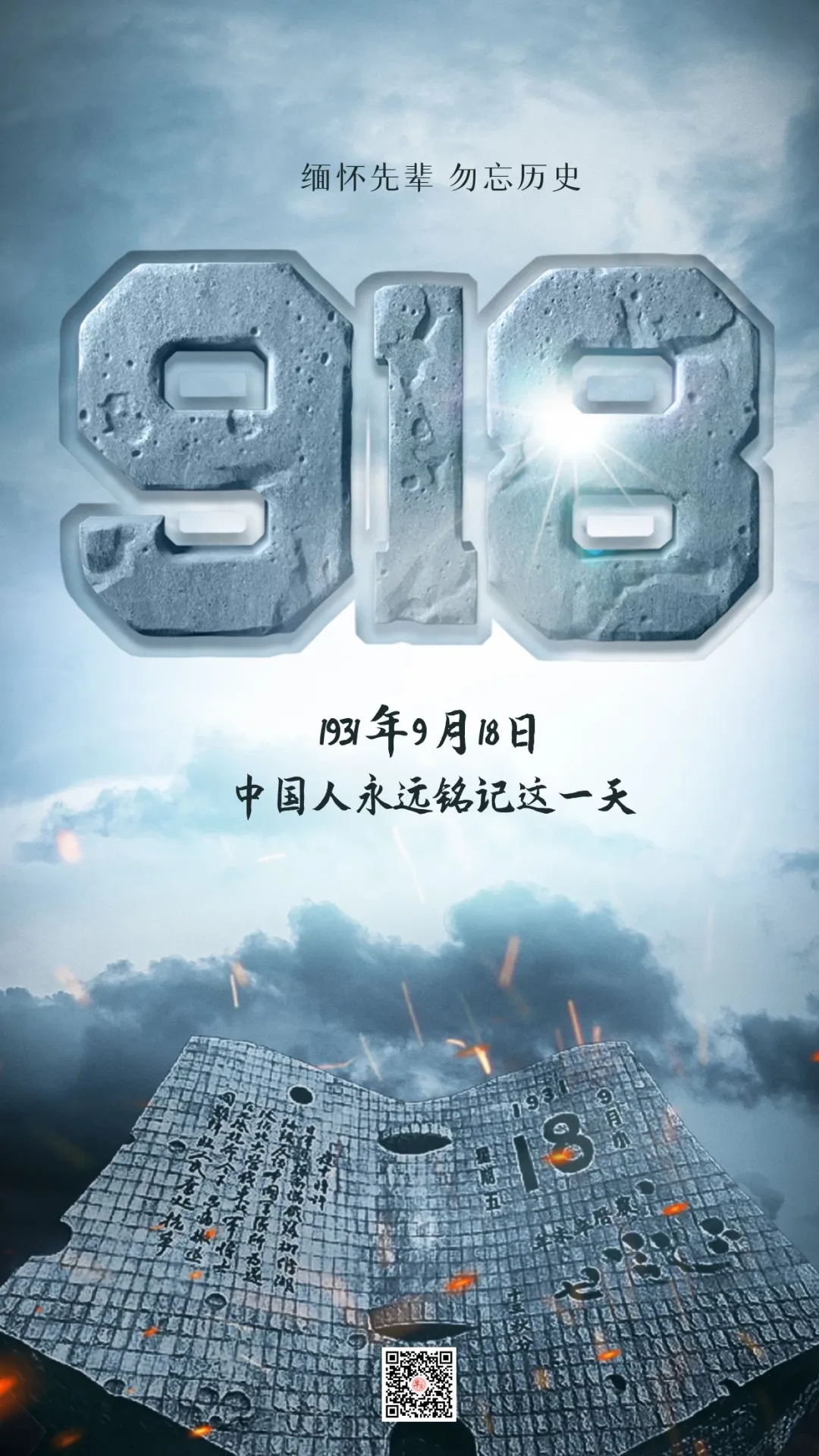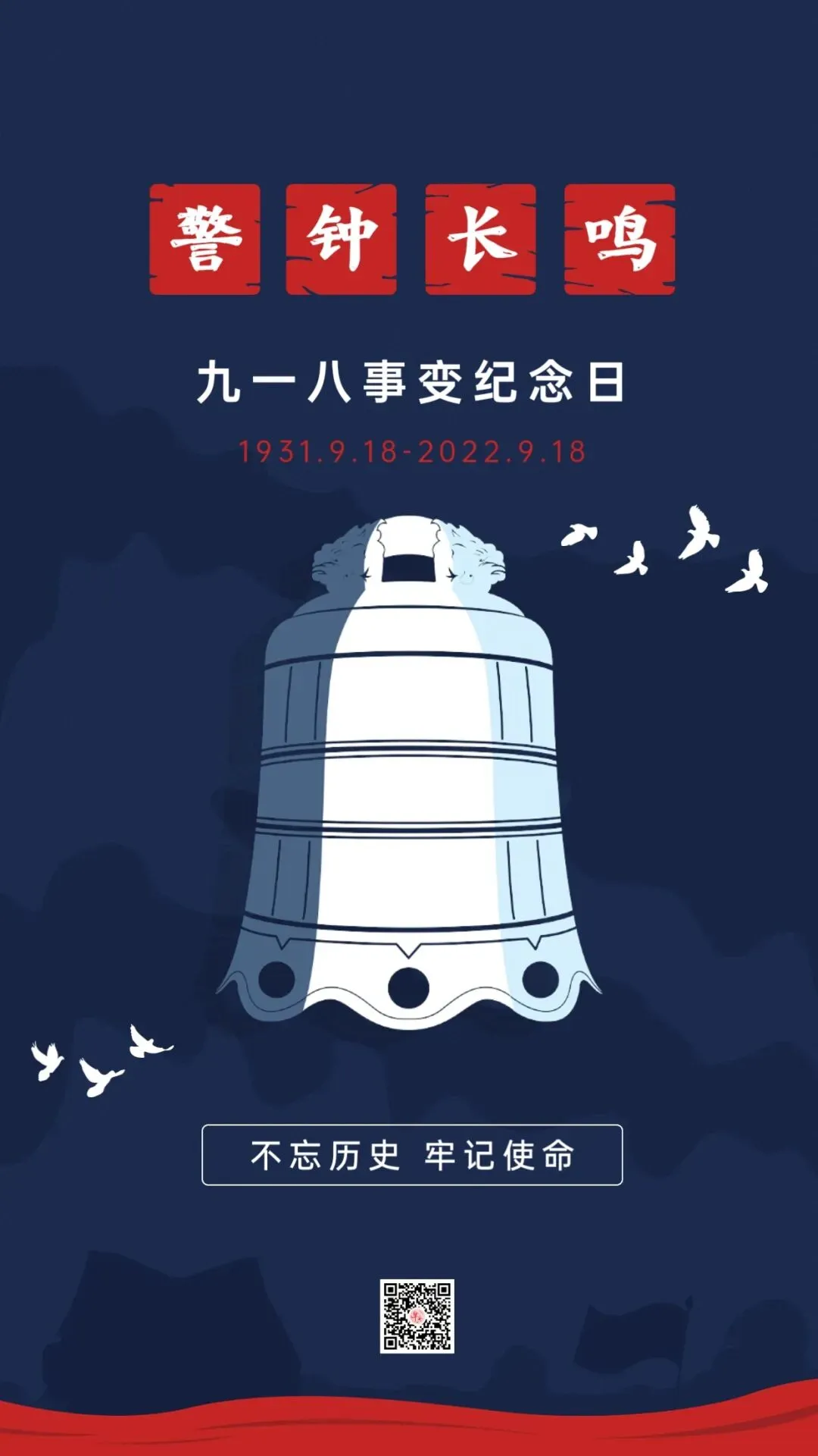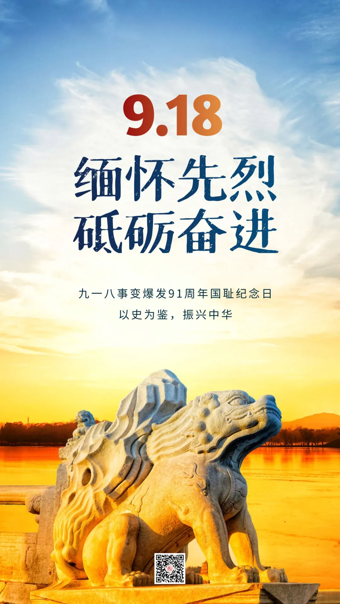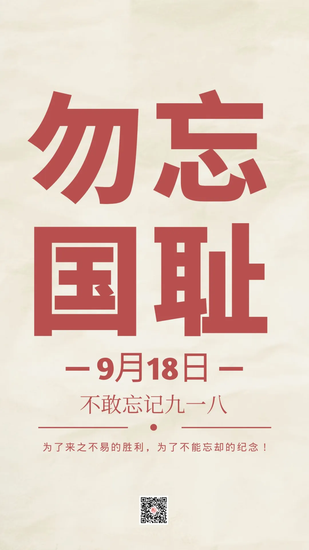 九·一八日,风雨潇潇,惨痛记忆,仇恨刻骨,日月同悲,全国哀悼。警笛声声,追思往昔,缅怀先烈,展望今日,同仇敌忾。九一八纪念日,警钟长鸣,勿忘国耻,努力奋斗,保卫中华!