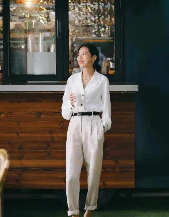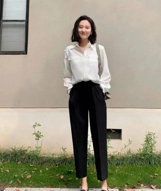 白衬衫+黑烟管裤+黑乐福鞋 , 经典到不会出错。