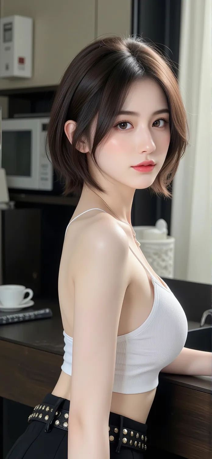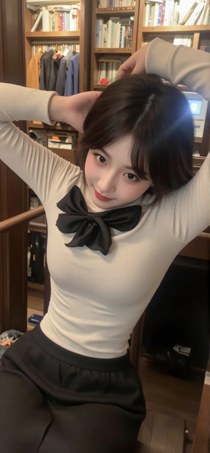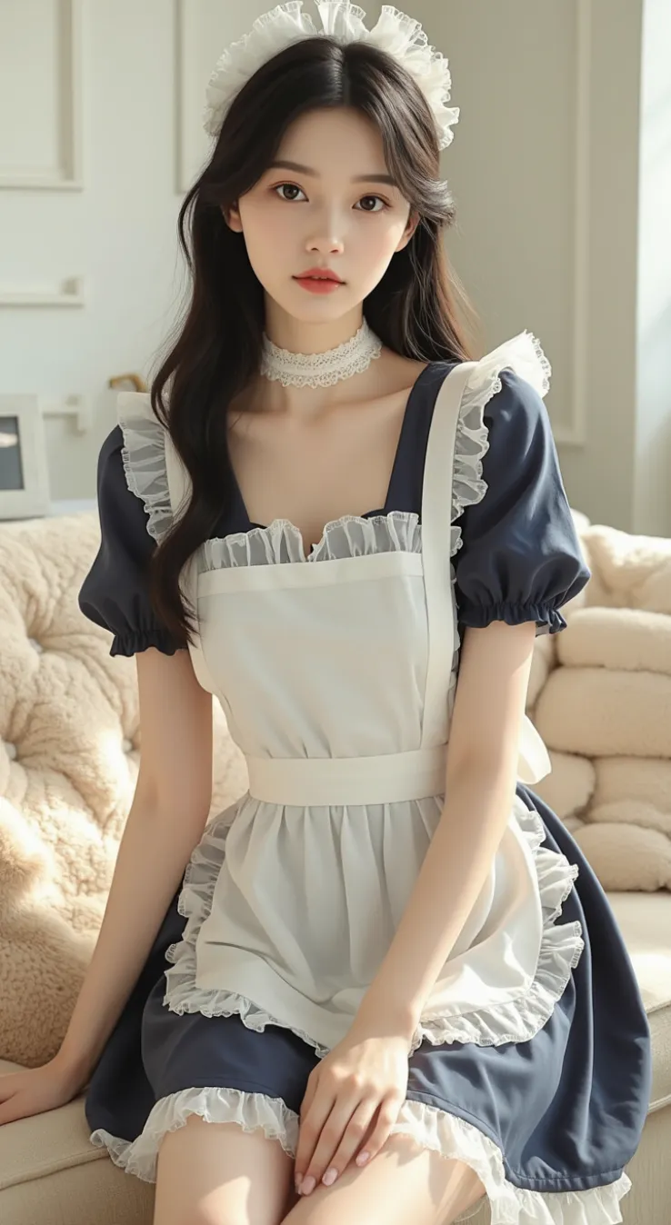 一路畅通地滑向腰间——就在那里,被系带稳稳地、不容分说地“握”住。我一抬手想去调整头上的发箍,这个动作让侧腰的衣料被微微牵扯,那道被勾勒出的、向内凹陷的阴影,在室内柔和的光线下无所遁形,腰肢细得仿佛能被这满室的温馨气息穿过。而裙摆,在坐下来时顺从地覆在腿上,但我知道,当站起身,它包裹下的、从纤细腰肢到饱满臀部的流畅起伏,会是另一道沉默的风景。我就这样坐着,蕾丝项圈贴着脖颈,传来一点轻微的、充满仪式感的束缚。空气里有家里令人安心的味道。我知道这身打扮充满了“角色”的戏剧感,知道每一个蕾丝花边都在说着“乖巧”与“服务”,但镜子诚实地告诉我另一件事。所有的甜美符号,泡泡袖、围裙、蕾丝,在这具被它们共同勾勒出的、起伏惊人的身体曲线面前,都成了最性感的衬托。原来最顶级的狩猎,真的可以穿着一身最乖巧的制服,然后安静地,成为自己领域里,那幅最矛盾也最诱人的画。秋季纯欲女仆风 #蜂腰翘臀杀 #深蓝色女仆装 #蕾丝装饰 #围裙穿搭 #宅家写真 #甜欲风 #反差美学 #氛围感女友 #OOTD