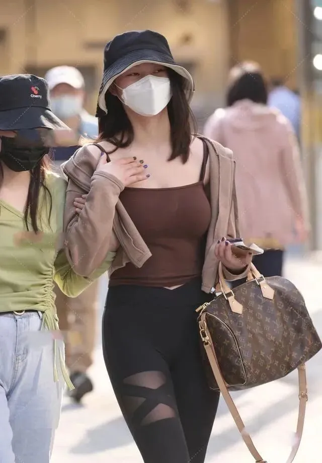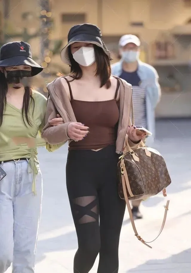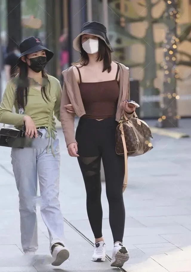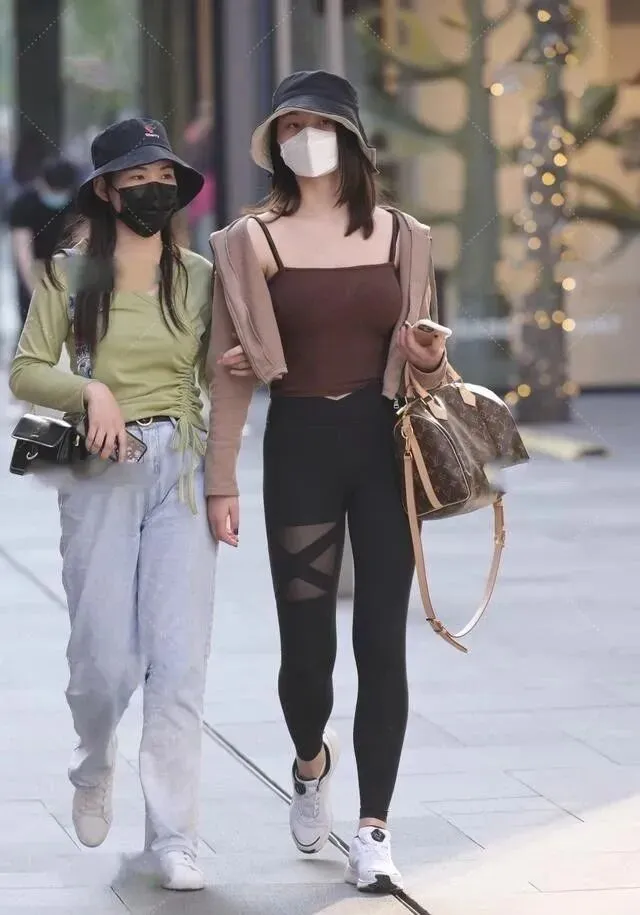 裤子小姐姐搭配了一条紧身的黑色瑜伽裤,棕色和黑色的暗色系的撞色在视觉上不会给人一种很突兀的感觉,看上去非常的舒服,瑜伽裤是非常舒适百搭的,穿在身上轻巧舒适,高腰的版型可以拉高我们腰部的线条,修身的裤子紧紧的包裹住小姐姐的腿部,显的腿又细又直。但是腿部不是很直的女生还是不建议选择这种紧身的瑜伽裤的,会把腿部的缺陷都暴露出来。