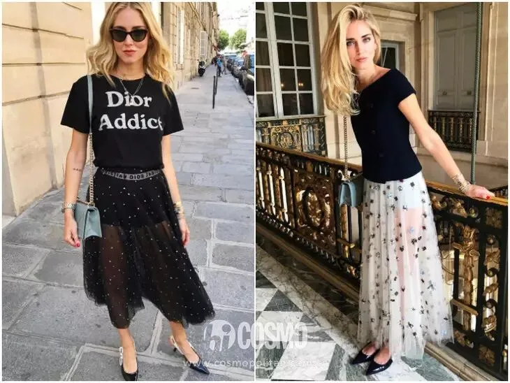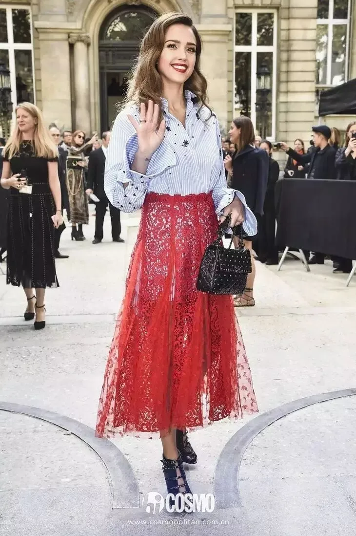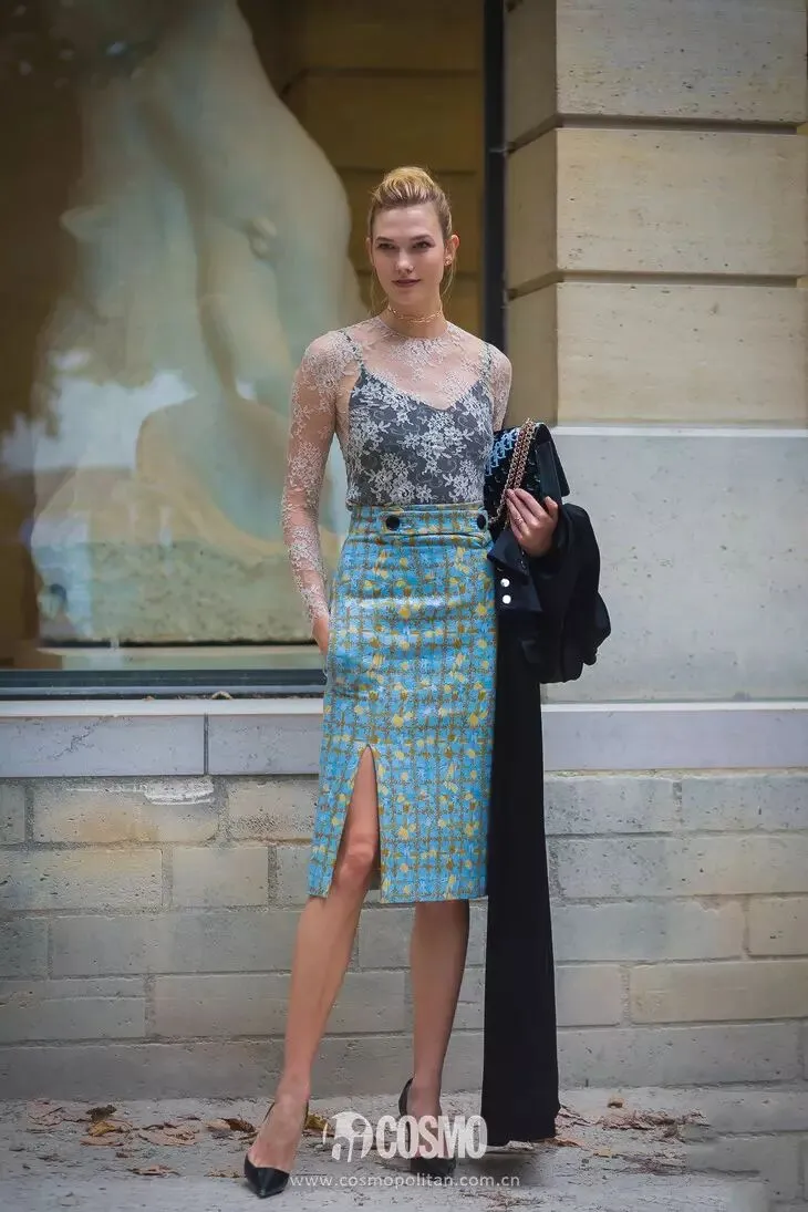 蕾丝半裙也可以选择相对飘逸的长款,搭配一件硬朗的上装单品是今年的趋势之一。