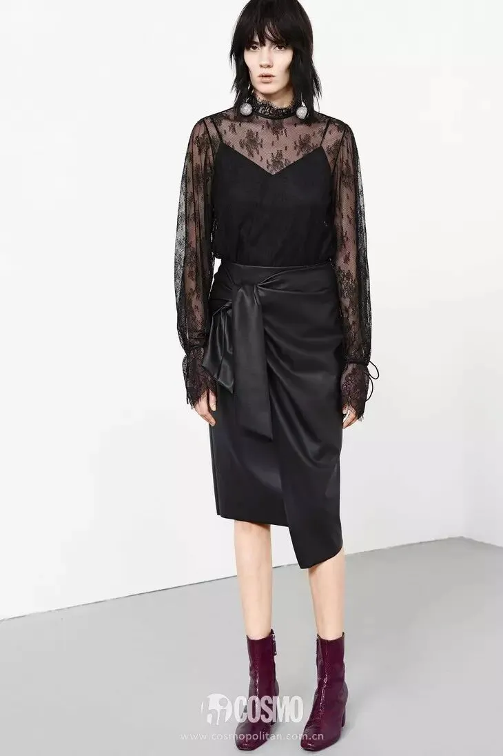 蕾丝半裙还可以和质地比较硬挺的上衣搭配,这种软硬面料结合的搭配硬朗和柔美兼具。