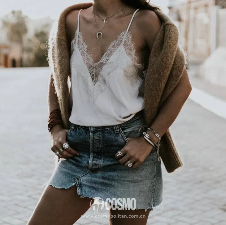 很多博主都喜欢用蕾丝吊带作为内搭,比普通的纯色吊带多了一份性感不说,像是一些丝质的蕾丝吊带穿着感也很舒服。