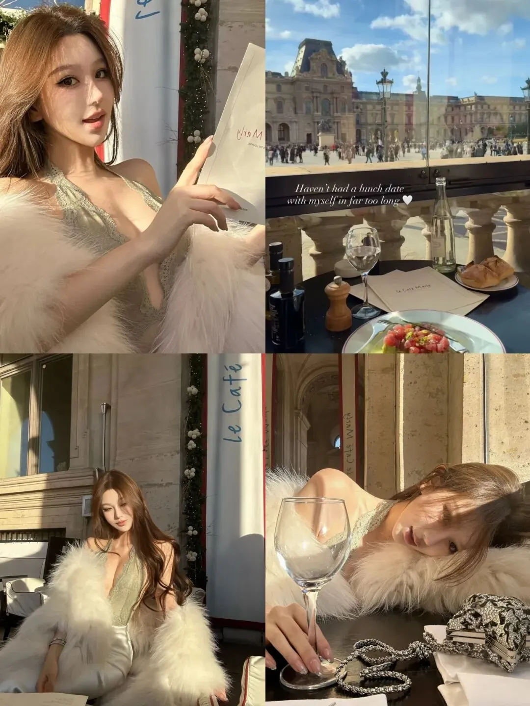 毛绒披肩不是厚重的 “保守款”,是软乎乎的 “能团在手里” 的暖,裹在臂弯时刚好接了蕾丝的柔,不用压也不用遮,漏着肩窝的软也冻不着;鞋子是方头软跟,不是尖到晃的 “性感高跟鞋”,踩在咖啡店地砖上,蜷腿时鞋跟也不硌脚;连项链都是细链,不是坠得慌的 “大钻款”,贴在颈窝时,只跟着呼吸轻晃,不用怕勾到蕾丝。