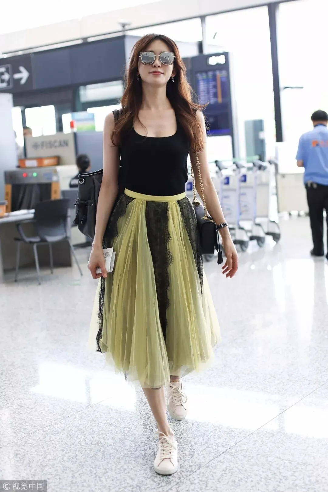 林志玲银色墨镜遮面,身穿黄色拼接百褶纱裙,上衣是简单的打底背心,与裙摆上点缀的黑色蕾丝完美契合,穿上蓬蓬纱裙的志玲姐姐很有芭蕾舞者的既视感。