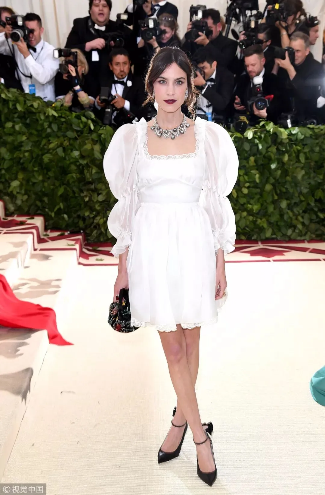 高傲如艾里珊·钟(Alexa Chung)也为蕾丝倾倒,白色泡泡袖短裙的缎面材质极富光泽感,镶以花边蕾丝的大方领复古感十足。她别出心裁的涂上了绛红色唇膏,仿若一个冷峻的冰雪美人。