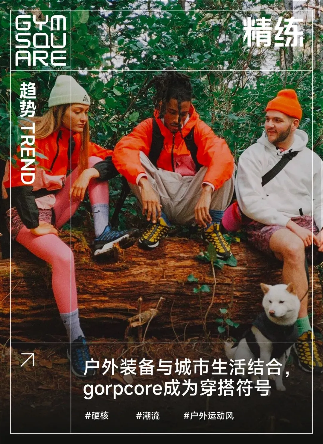 穿搭成为了一种文化符号,gorpcore是一种年轻人的生活意志体现,他们想用穿搭为自己在高楼林立的城市生活打上绿树红花的户外标签。■ GYMSQUARE