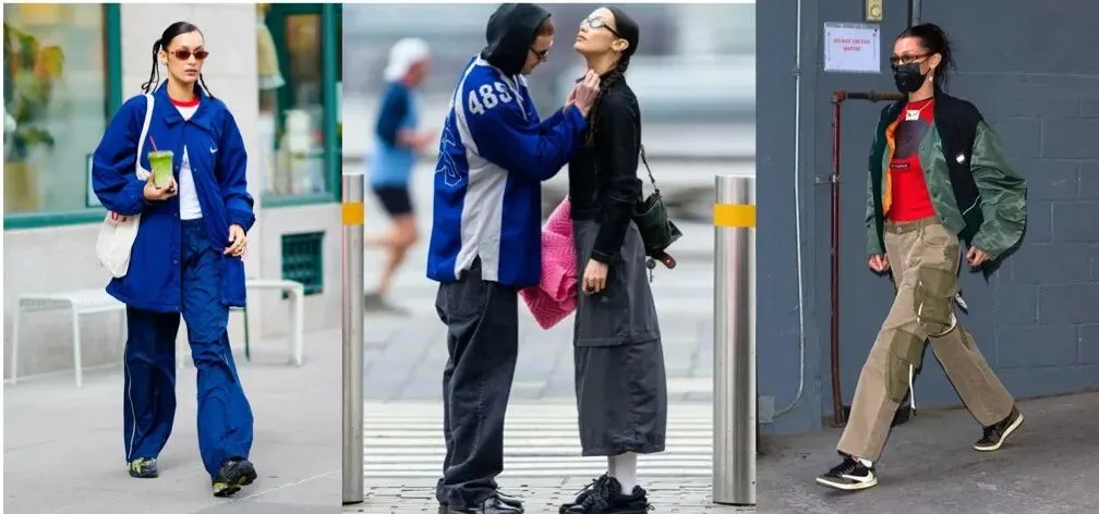 而超模bella也在 gorpcore 的穿搭风潮上起到了很大的影响作用,一改往日凸显曲线的辣妹风格,近两年多以复古户外元素,结合冲锋裤、防风夹克等单品的时尚造型被街拍捕捉。