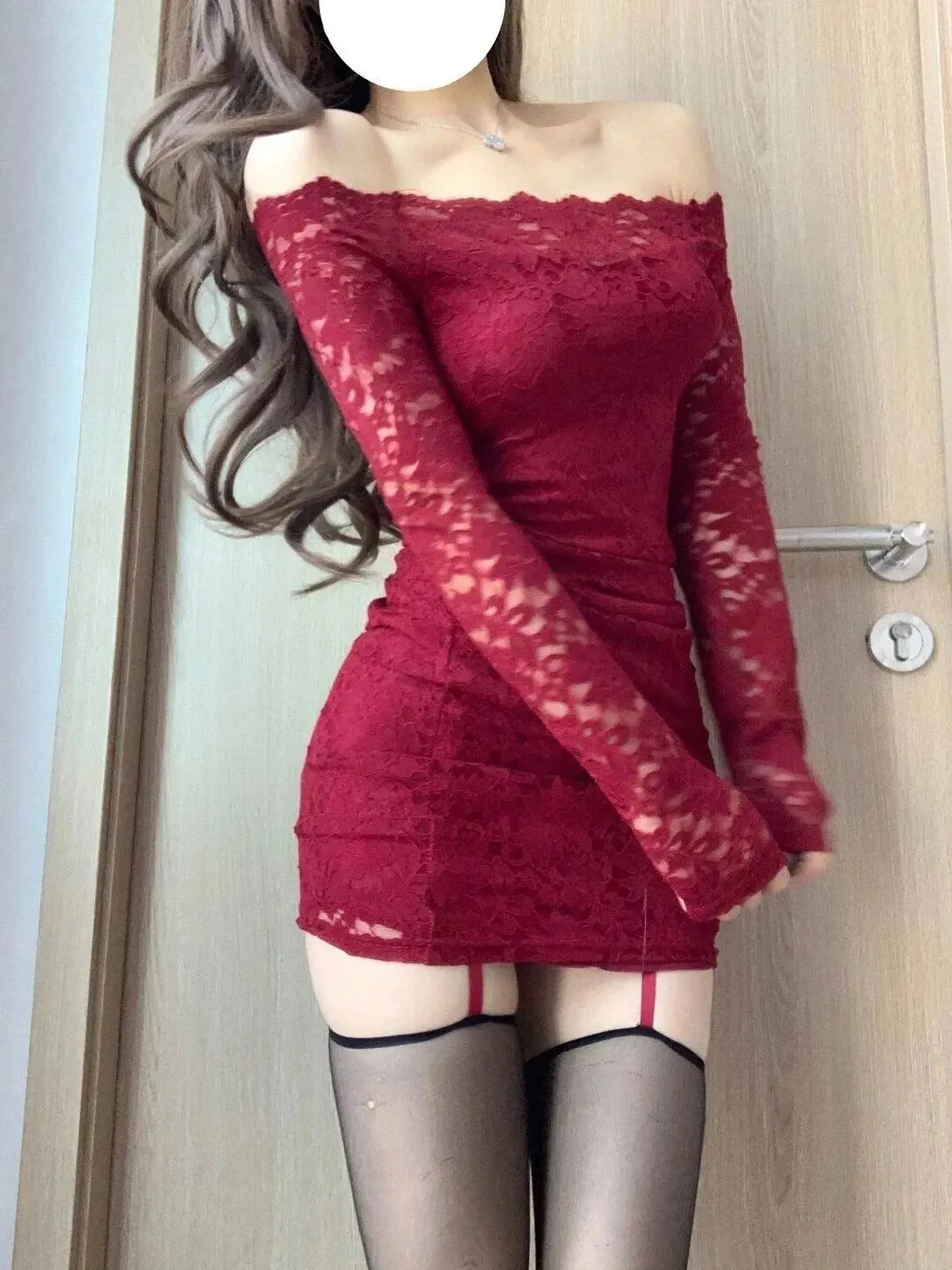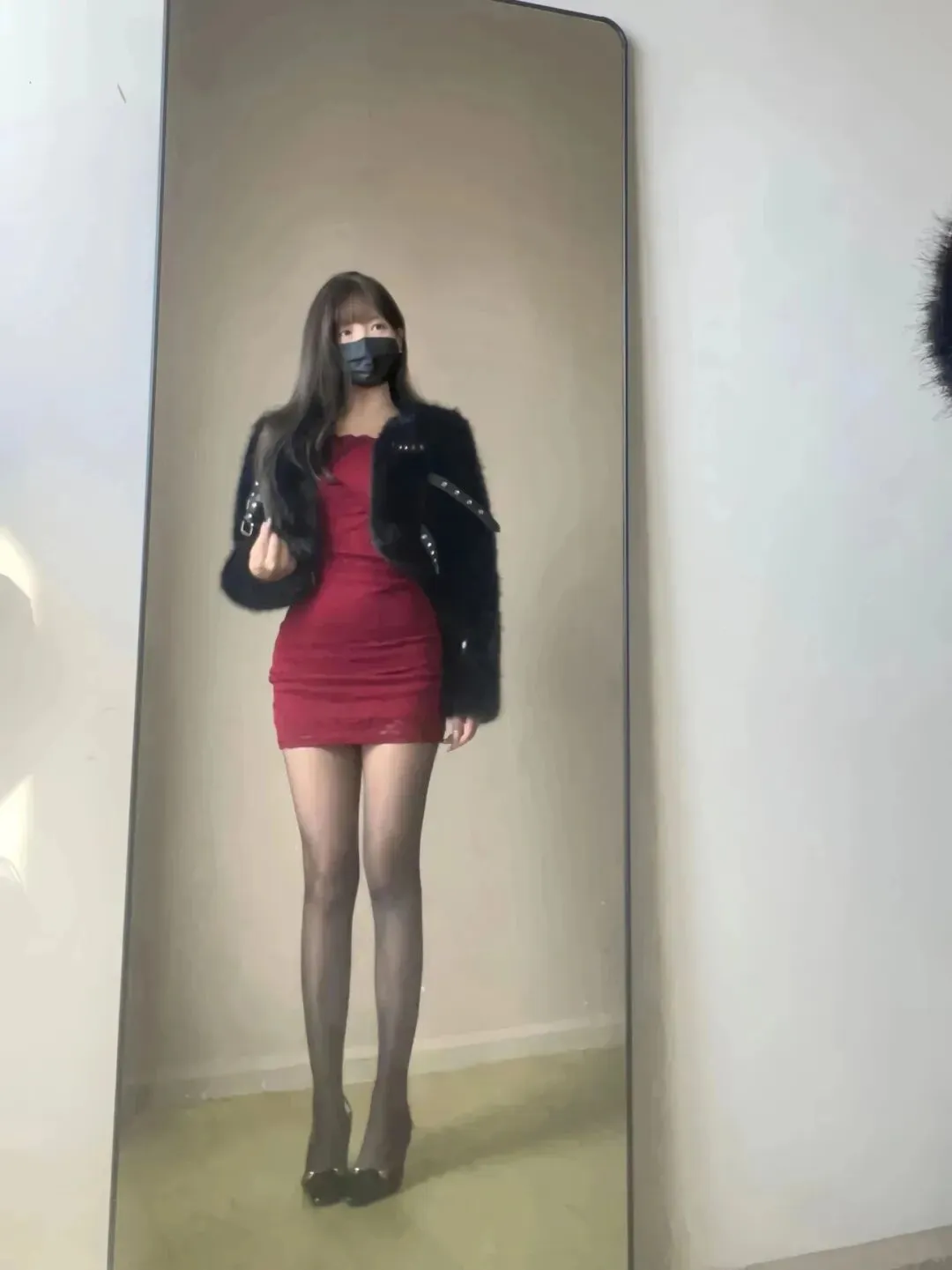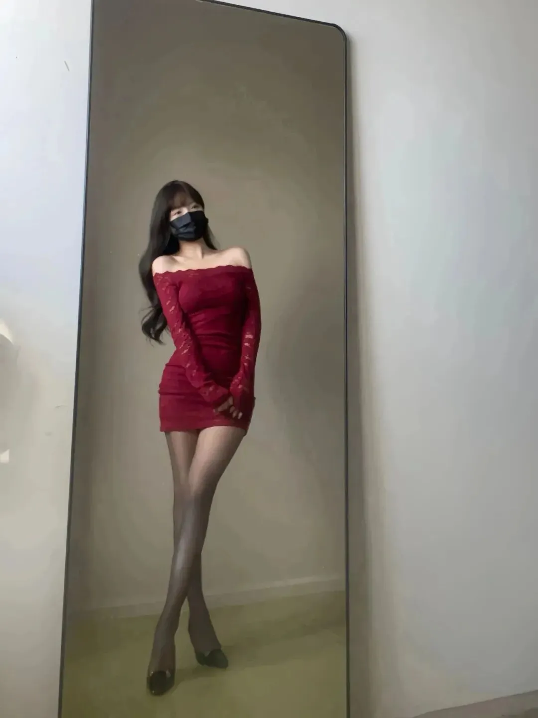 镜前的姿态更是将这份风情揉得恰到好处:单手轻搭肩头时,是不经意的慵懒;双腿交叠侧身而立时,是曲线的婉转;双臂环抱于身前时,又多了几分清冷的疏离。黑色口罩遮住半张脸,反而让视线更聚焦于穿搭的细节与身形的韵律,长发垂落肩头,卷度与蕾丝的纹理相映成趣,在素净的墙面、木质门与布艺沙发的背景里,酒红裙装的明艳愈发突出,像是在平淡日常里撕开了一道浪漫的口子。