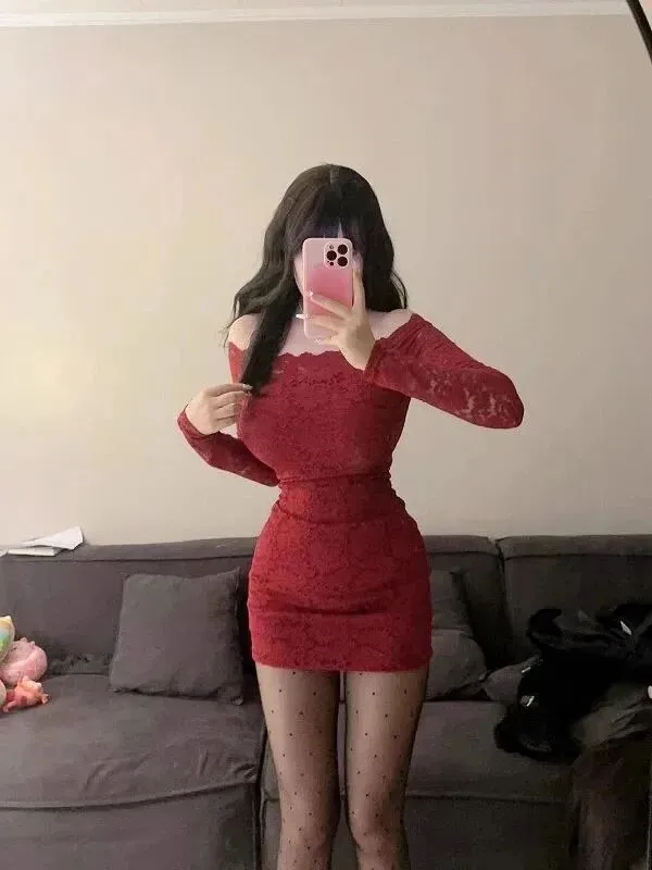 裙身是修身的包臀剪裁,将腰线与臀线的弧度温柔勾勒,蕾丝的镂空纹理在酒红底色上织就出朦胧的美感,长袖的设计又添了几分含蓄,指尖处的蕾丝微垂,似有若无地撩动着视觉神经。一字肩的领口利落露出精致的锁骨,肩颈的留白与裙身的繁复蕾丝形成巧妙对比,冷白皮与酒红色碰撞出浓烈又高级的色彩张力,像是暗夜里绽放的红玫瑰,娇艳却不张扬。