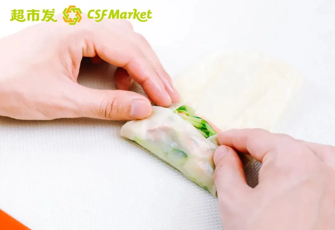 (1)取适量馅放在春卷皮中间。左右向内折叠,再上下卷起。
