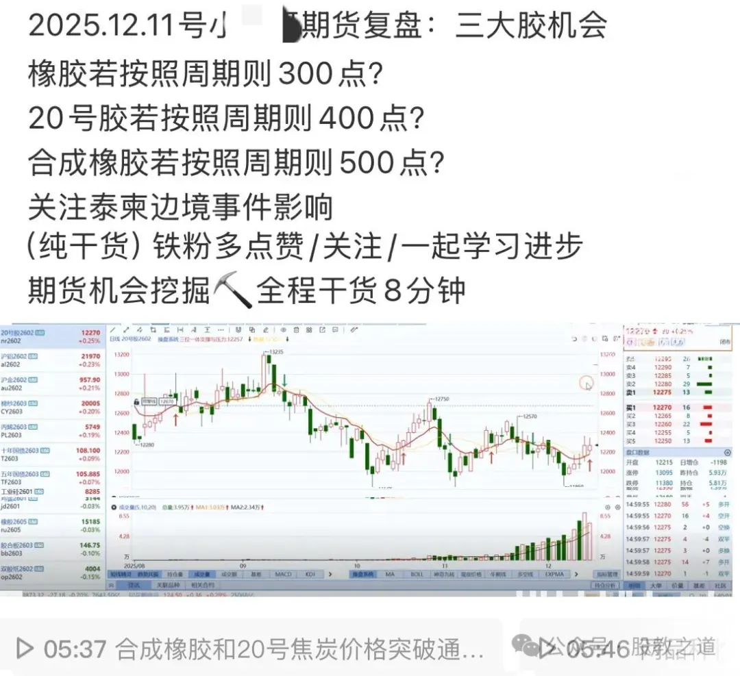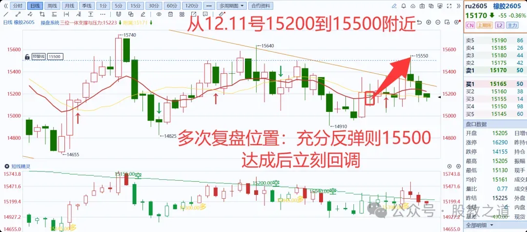 首先是橡胶:从12.11号15200看到上方15500附近,多次复盘视频均有,全程见证,其次完成300点后量价标准,随后回调!