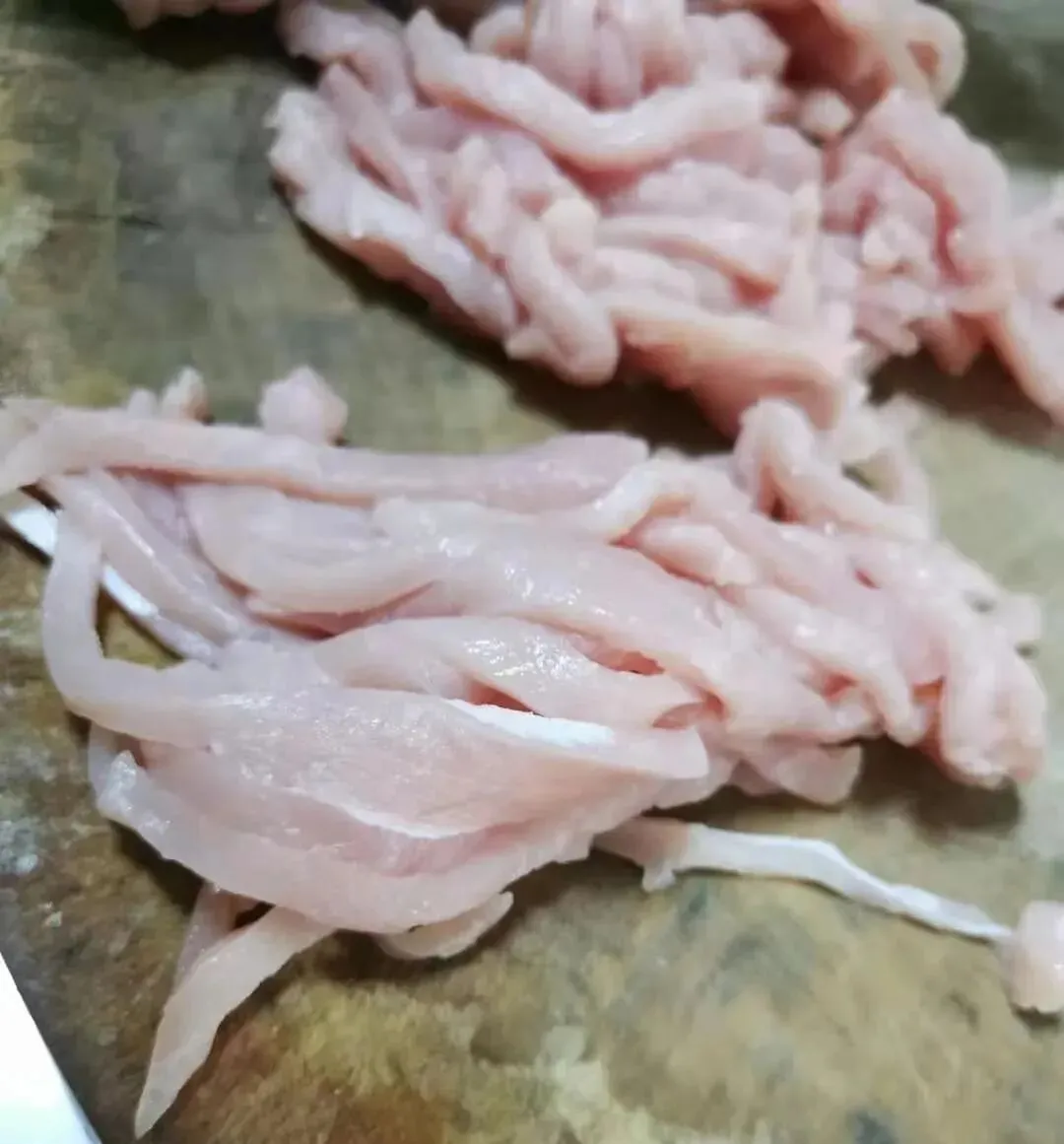里脊肉片薄,切成细长丝。这一步极其考验刀工,对刀工不太自信的朋友,可以提前把肉冷冻一会。