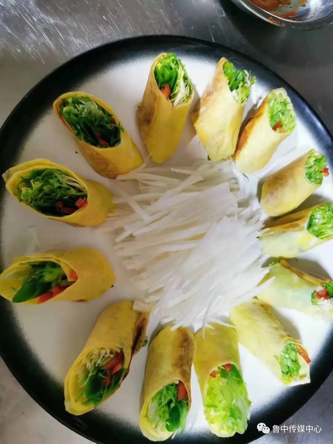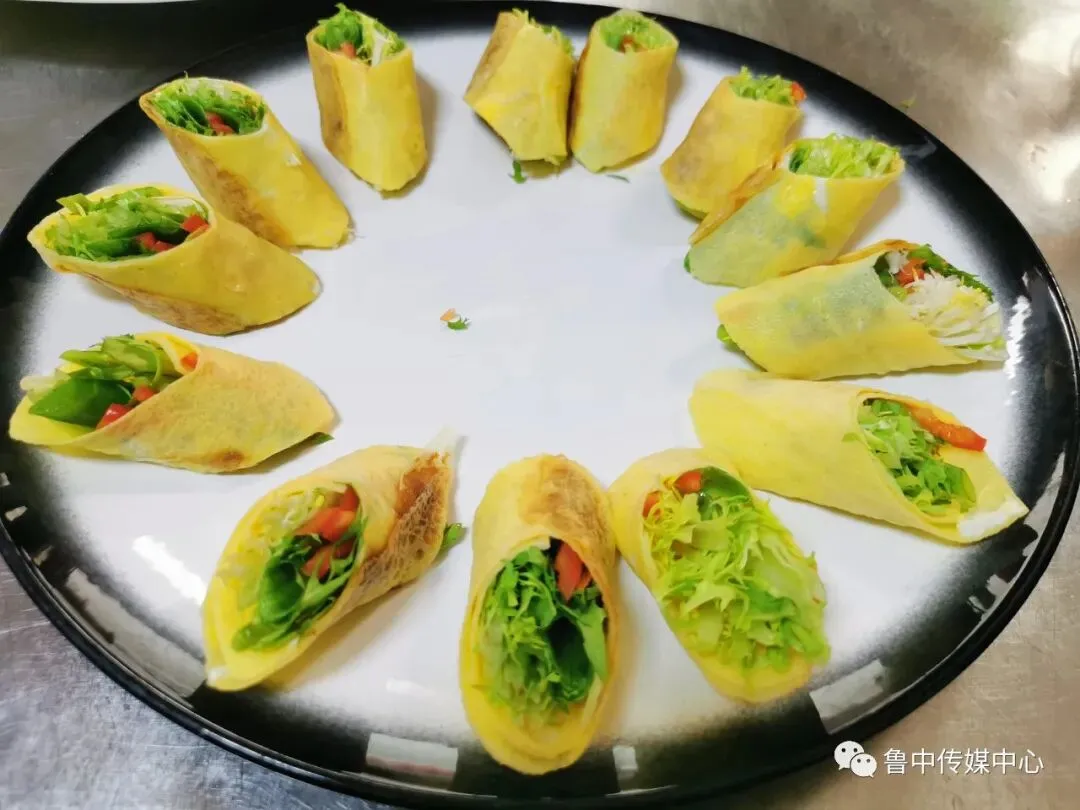 腌肉的间隙,做一个蔬菜鸡蛋卷,充分的荤素搭配。鸡蛋饼事先已经摊好,也可以用干豆腐皮代替。包裹上喜欢的蔬菜,这里特别推荐,苦菊、葱丝和甜椒,红绿搭配,颜色清新,极具颜值。不要吝啬力气,一定要卷结实,这样切的时候不会散。切成小段之后,就可以装盘备用了。怎么样,是不是很漂亮?