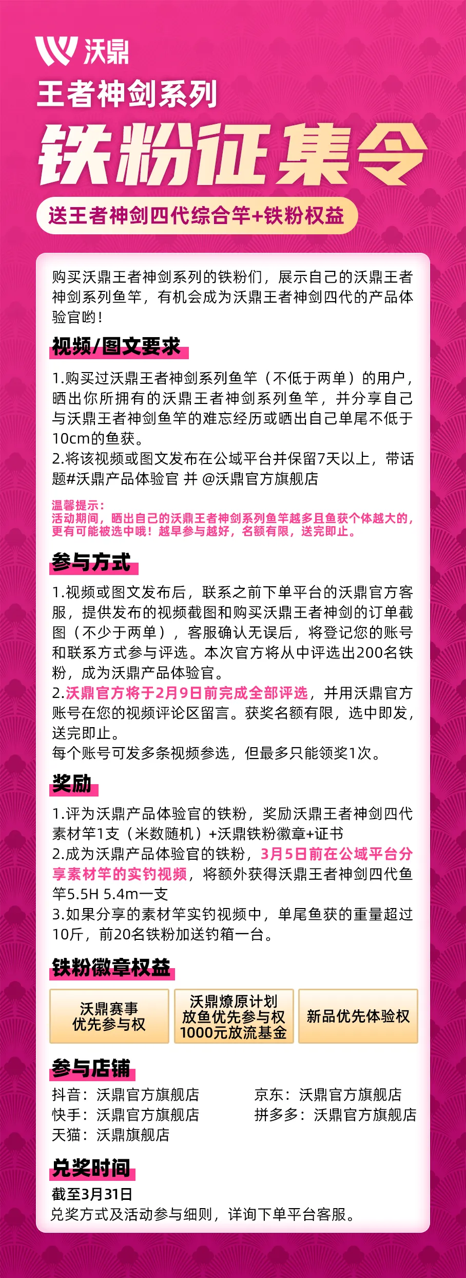 当前位置:首页>美女资讯>铁粉征集令 | 200支沃鼎王者神剑四代综合竿+铁粉权益等你来领取!