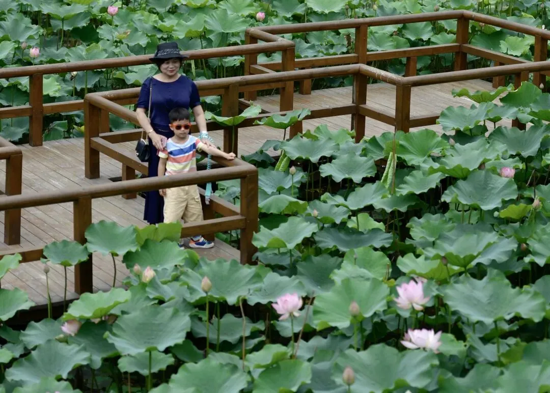 近段时间,杨府山公园“花事”不断,月季、绣球花尚在盛放,园内的荷花也已经在悄悄“努力”,准备惊艳所有人。亭亭玉立的荷花宛如粉色的点点繁星,随风摇曳,前来赏花的市民沿着荷花池里的木栈道悠然穿行,宛如一幅“曲桥荷韵”的醉美画卷。