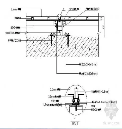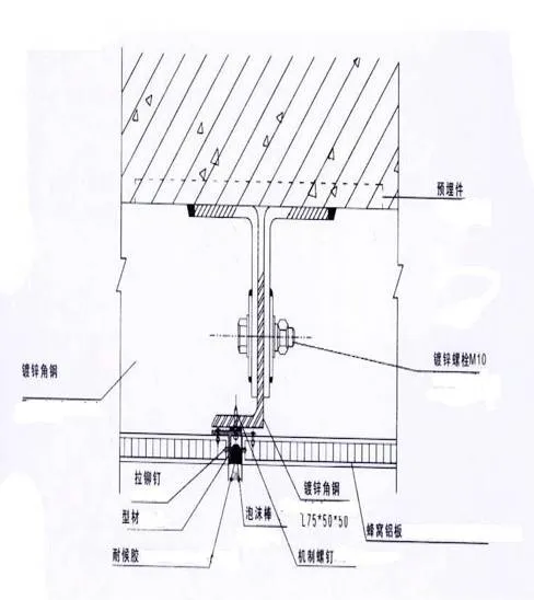 4.2、固定骨架的连接件:骨架的横竖杆件是通过连接件与结构固定的,而连接件与结构之间,可以与结构的预埋件焊牢,也可以在墙上打膨胀螺栓。因后一种方法比较灵活,尺寸误差较小,容易保证位置的准确性,因而实际施工中采用的比较多。须在螺栓位置画线按线开孔。