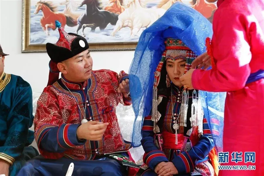 11月17日,在内蒙古鄂尔多斯市鄂托克前旗乌提嘎查,新郎那音巴图为新娘乌云塔娜掀开盖头。“鄂尔多斯婚礼”是内蒙古鄂尔多斯地区传统民俗,形成于蒙元时期,至今已流传700多年,目前仍然比较完整地保留着鄂尔多斯婚礼的哈达定亲、佩弓娶亲、献羊祝酒等程序。婚礼通过优美的歌舞和隆重的仪式,表达对美好生活的追求。2006年,“鄂尔多斯婚礼”被列入国家级非物质文化遗产名录。