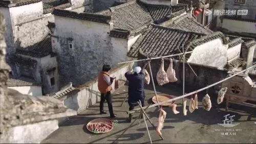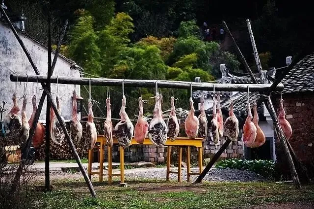 徽州地处山区,每年进入冬季以后,水寒山瘦,这时,人家饲养的土猪已经成熟,宰割后腌制的火腿在低气温环境下慢慢风干。