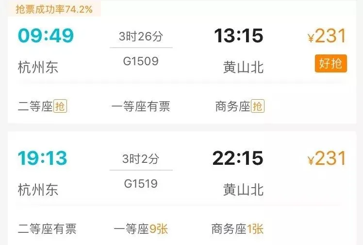 小飞君顺便查了一下杭州到黄山的高铁,不过三个半小时,简直可以说走就走。