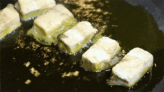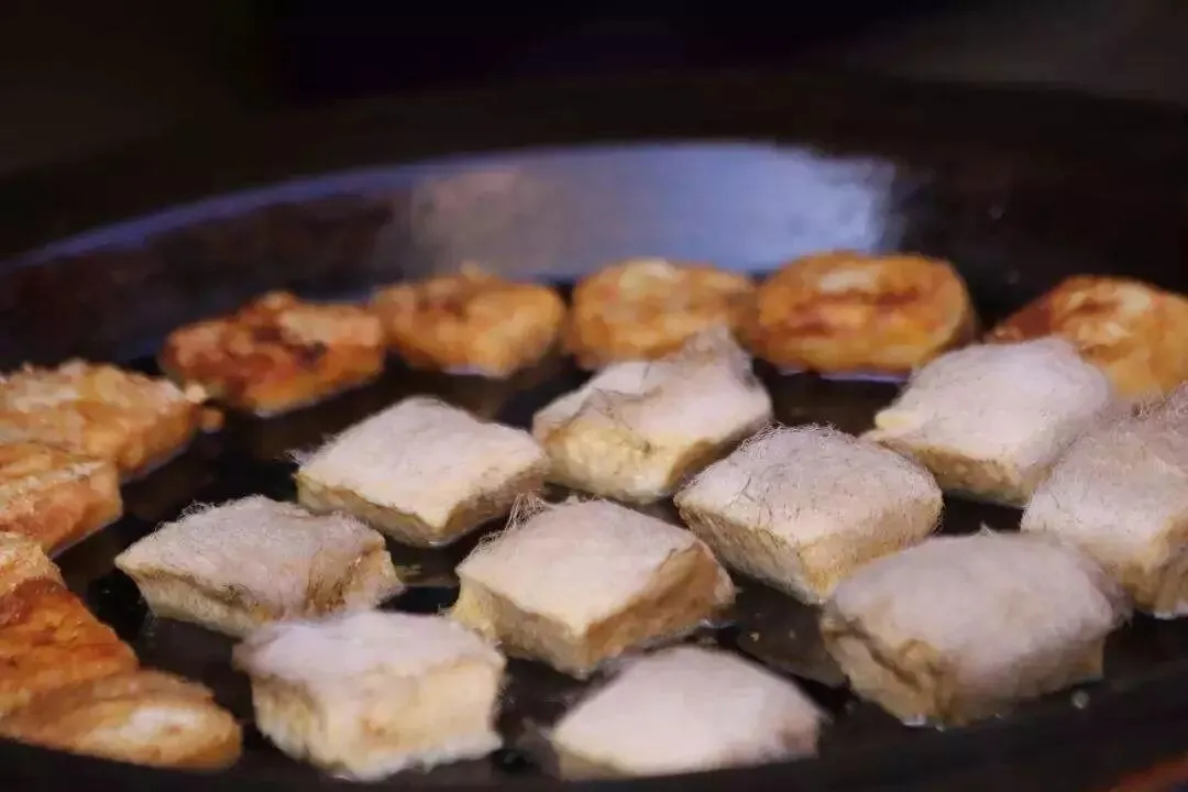 实际上煎毛豆腐的口感却是表皮微焦、内里腻滑,原来的豆腐结构在菌丝的分解下完全变成美味的氨基酸,类似正在融化中的蓝莓奶酪。