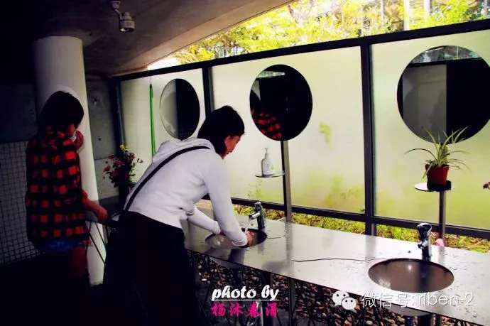 (这是一家被称作百花餐馆的洗手间,因为是建在室外,一片树林中,玻璃透过来太阳的光线,以及植物的自然葱翠。)