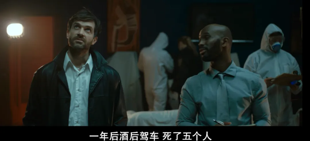 而根据前面探长对死者B男的身份核实,观众不难猜出,曾车祸将人卷入车轮之下的B男,算是形式对等的因果报应——两条叙事线相辅相成。