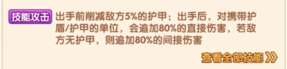 金蕊梵心问的技能攻击继续加强了本身对于护甲清除的能力。在白板的情况下,配合法术充能每回合可以削减敌方15%的护甲值;并且对于拥有护甲的敌方神将会追加80%的直接伤害,对没有护甲的神将追加80%的间接伤害,同时兼顾直接伤害和间接伤害,多重攻击方式保证无论敌方是否有护甲存在,都可以最快速地打出巨额伤害。