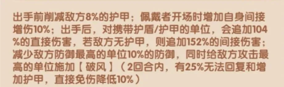 金蕊梵心问残卷三星在保证直接伤害与间接伤害的同时,额外增加了“破风”buff,其在三星时有25%的概率让敌方无法回复和增加护甲,在五星是概率更高达40%,并且降低敌方神将的直接免伤