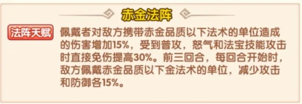 法阵天赋让赤金法术多了一套属性,而且是压制性的属性,使其在白板阶段上阵即可发挥巨大作用,同时保证自己对同星紫金法术的压制力。