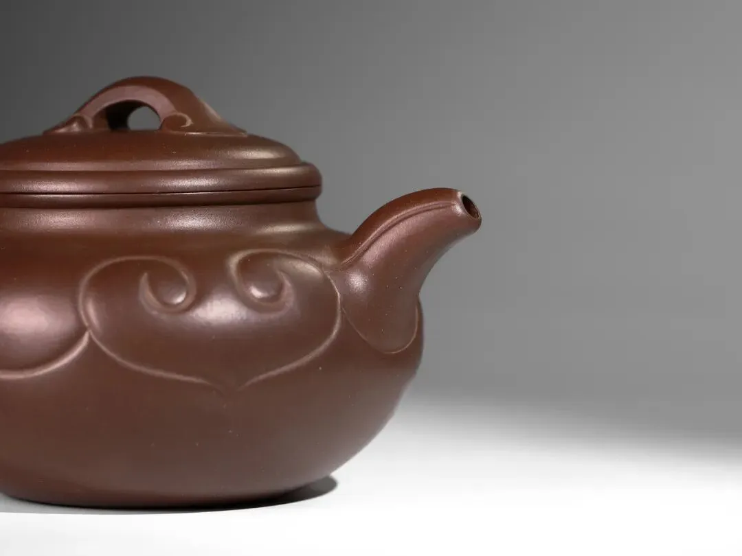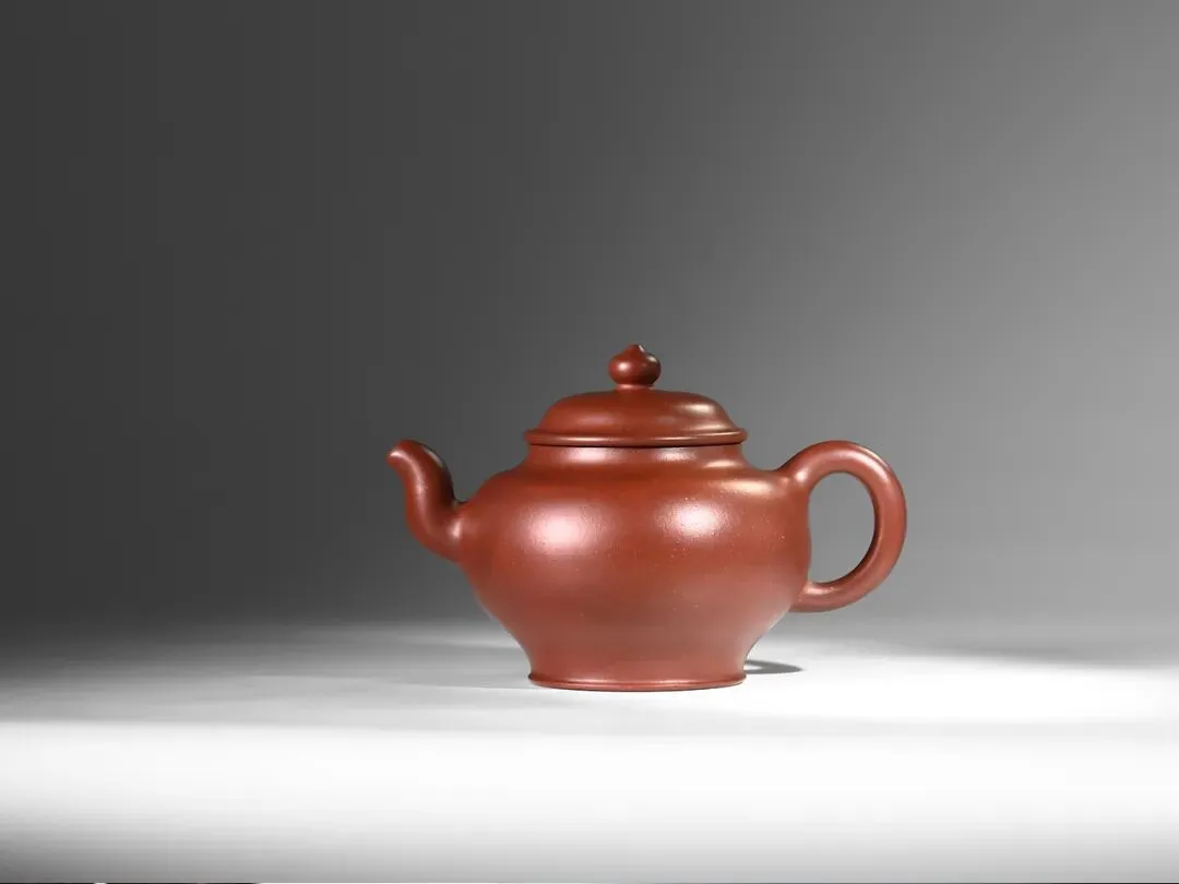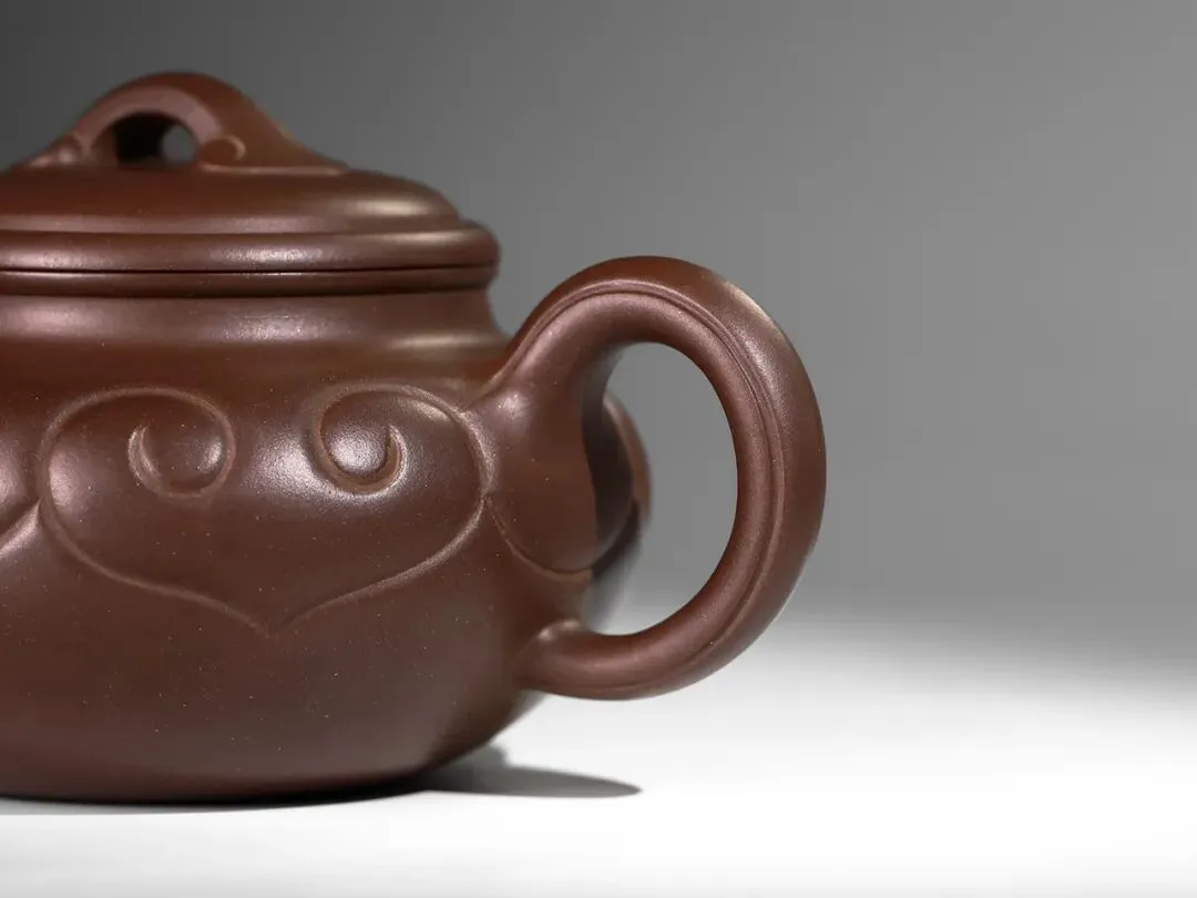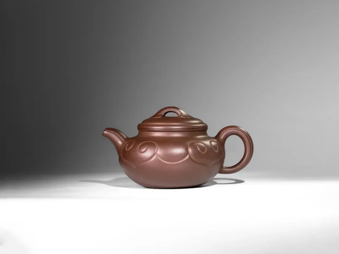 全手工制作,附作品收藏证书。仿古如意壶,承景舟遗韵,续紫砂正脉,将青铜器的古穆庄严与“如意”纹样的祥瑞祝福,熔铸于一手可握的茶器之中。周桂珍先生此作,以其师顾景舟亲传之手艺与心法,再现了这一经典器型的精髓,不仅是对技艺的传承,更是一场与宗师跨越时空的匠心对话。壶取上乘泥料,胎骨匀亭,泥色温润。其形制源自古青铜器,气度敦厚饱满,壶身扁圆如鼓,四片丰腴的如意纹自壶腹自然舒展,构成壶身主体,寓意“事事如意”。子母线吻合严密,形成一条饱满的灯草线,口盖各占其半,工艺精湛巧妙。此作之魂,在于对“如意”主题的立体演绎。如意云纹连绵起伏,如“一串云”环绕壶身,象征高升与祥和,线条行云流水,在静穆的壶体上注入灵动气韵。盖顶的如意桥钮与壶身纹样遥相呼应,新颖别致,成为统摄全局的点睛之笔。周桂珍先生以女性特有的细腻感知,将这些线条勾勒得起伏有致,既保留了原器的古雅厚重,又赋予其温润亲和的生命呼吸感。作为顾景舟先生的入室弟子,周桂珍以这把壶完成了对师门最高技艺与美学理念的虔诚承袭。它不只是一件实用茶器,更是一件承载着紫砂正脉基因的传世之作。在它圆融的线条与祥和的寓意中,凝固的是一代宗师的匠心,连接的是传统与未来。