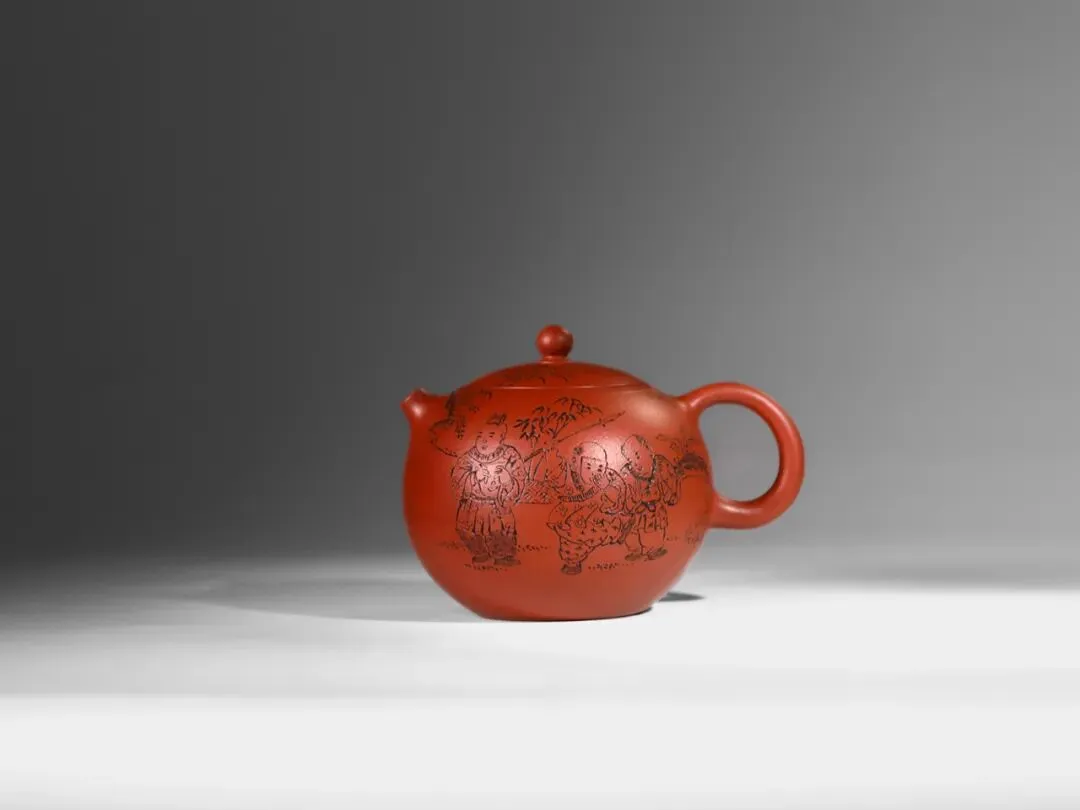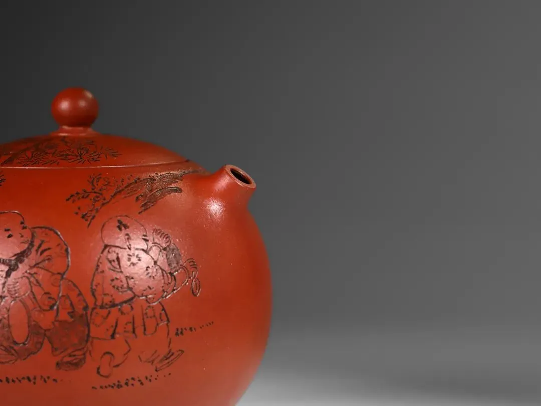 全手工制作,附作品收藏证书。 一粒珠壶,以圆为境,以珠为魂,在极致的简约中诠释紫砂光素器“圆、稳、匀、正”的至高法则。李寒勇先生此作,取深润泥料,塑丰腴之形,将经典一粒珠的浑圆气韵与江南女子般的灵秀风姿完美融合,成就了一件气韵生动、寓意吉祥的案头妙品。壶取上乘泥料,窑烧得法,成色黯雅清新,如墨玉含光,在光线下泛起温润内敛的宝光,质感非凡。其造型承袭古制,壶身若丰乳楚腰,饱满圆融,轮廓线自壶盖至壶腹再到底部,流畅无一丝滞涩,宛如一颗浑然天成的宝珠,又似一位身着素衣的江南女子,亭亭玉立,于古朴中透出“娇而不媚”的灵动意蕴。工艺之妙,在于对形体节奏的精准把控。作者通过手法的抑扬顿挫与轮廓的刚柔疏密,赋予静态壶身以音乐般的律动感,使整器在“圆、稳”的基调下,呈现出清新爽利、鲜活生动的艺术特色。壶嘴一弯流胥出自然,壶把圆润称手,与壶身气韵贯通,浑然一体。此作的人文厚度,更由壶身满刻的百子百福图所奠定。此精妙刻绘由芝兰阁欧咏完成,画面繁而不乱,孩童嬉戏其间,寓意多子多福、吉祥圆满,为静雅的壶体注入了热烈的生命气息与美好的世俗祝愿。李寒勇先生以此壶证明,真正的经典,能在极简的造型与丰富的内涵间,找到永恒的平衡。