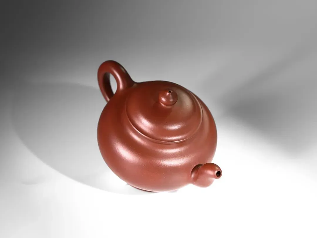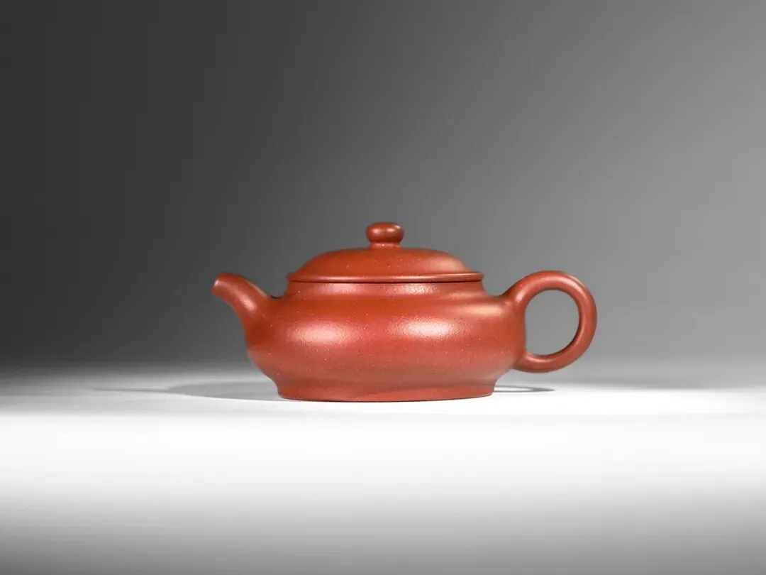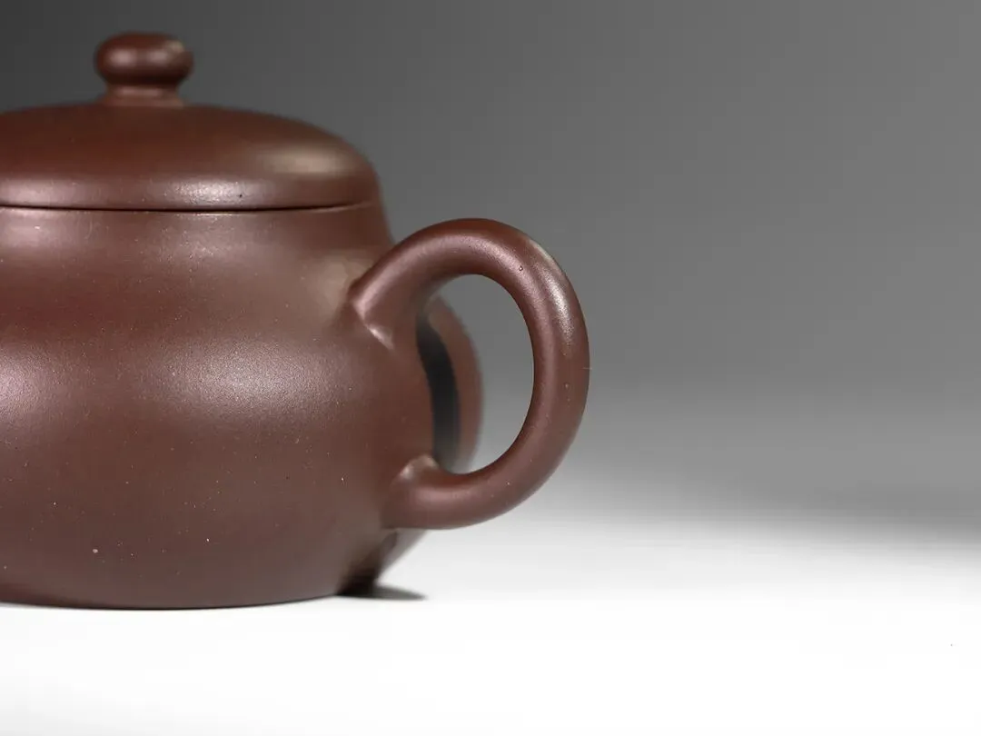 手工制作,附作品收藏证书。矮潘壶,承潘氏一脉古韵,以简练圆融之形,诠释紫砂光素器“藏锋于圆,纳道于腹”的至高境界。高旭峰先生此作,取经典清水泥为料,于敦厚稳重的传统框架内,注入当代审美所推崇的精准比例与精雅气韵。壶取优质清水泥,泥色纯正,胎骨温润。泥料本身质朴无华的属性,恰与矮潘壶型不求繁饰、以形取胜的本质高度契合,经明针精工,焕发出内敛的哑光质感,如君子谦和,光华自蕴。此作形制把握深得古法精髓,又见个人巧思。壶身呈经典的上缩下丰之态,壶腹圆鼓饱满,如藏乾坤,向下缓收成底,弧线流畅从容,一派雍容气象。一弯流柔美胥出,线条纤细却暗含劲道;环形壶把与之呼应,二者巧妙提升了整器的视觉重心,与丰腴壶身构成稳定的三角势态,动静相宜。壶盖设计尤为精妙,状若斗笠,斜肩而下,与壶口结合严谨。盖顶一枚圆珠壶钮小巧灵动,如画龙点睛,为敦厚的壶体平添一抹轻盈俏皮。整器在大气、简练、明快的总体风格中,通过每一处微妙曲面与精确转折,实现了实用性与艺术性的完美统一——出水利落畅爽,持握舒适称手。高旭峰先生以此壶,完成了对经典的深情对话与当代转译。它不仅是一件茶事良器,更是一件能安放于茶席、沉淀心绪的雅物,在圆融简朴的造型中,蕴藏着紫砂艺术历久弥新的生命力。