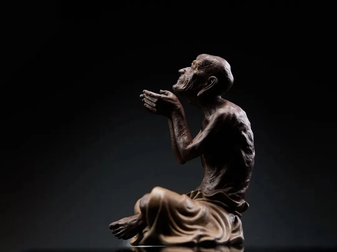 全手工制作,附作品收藏证书。悟达尊者,以紫泥塑禅骨,将修行者的坚韧形神与佛家的慈悲智慧凝固于永恒的瞬间。方贞先生此作,超越工艺陈设的范畴,以紫砂雕塑的语言,完成了一次对生命境界的深刻沉思与庄严礼赞。塑像取上乘紫泥为胎,泥色沉静,质感厚重。紫泥的可塑性与丰富的表现力,在此被运用至极致,完美承载了尊者历经风霜的肌体与超然物外的精神。此作之魂,在于对“苦修”形神极度写实又高度升华的塑造。尊者身形瘦骨嶙峋,盘腿而坐,每一处骨骼的突起、每一条筋脉的走向、每一片松弛皮肤的褶皱,皆被刻画得入木三分,仿佛能触摸到岁月磨砺与意志淬炼的痕迹。其双手呈虔诚捧举之姿,无声诉说着承接众生苦难的宏愿。最为震撼的是“开脸”所呈现的神性。尊者双目微闭,面容却无比宁静祥和,毫无苦痛之色。眉宇间慈悲内敛,嘴角似含无尽智慧,在极致的清瘦躯体上,散发出圆满的佛性光辉,实现了“形苦而神盈”的至高艺术境界。方贞老师以此尊雕塑,传递出超越艺术的本真哲思:外在的瘦削嶙峋,是去伪存真、摒弃虚浮的修行之路;内在的慈悲祥和,是脚踏实地、真诚付出所抵达的智慧彼岸。这不仅是一件雕塑,更是一面映照心灵的镜子,一座引人静观自省的精神丰碑。