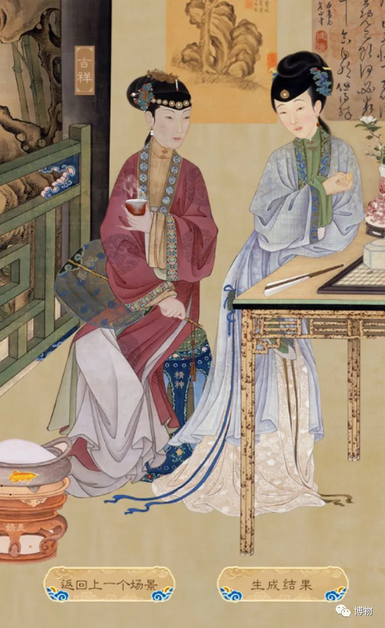 进入H5,会看到一些清宫皇帝宫妃的生活场景图,比如这幅“品茶图”,两个妃子在喝茶着棋,一派岁月静好。柱子上有个“吉祥”字样,这正是这个H5游戏的玩法所在。
