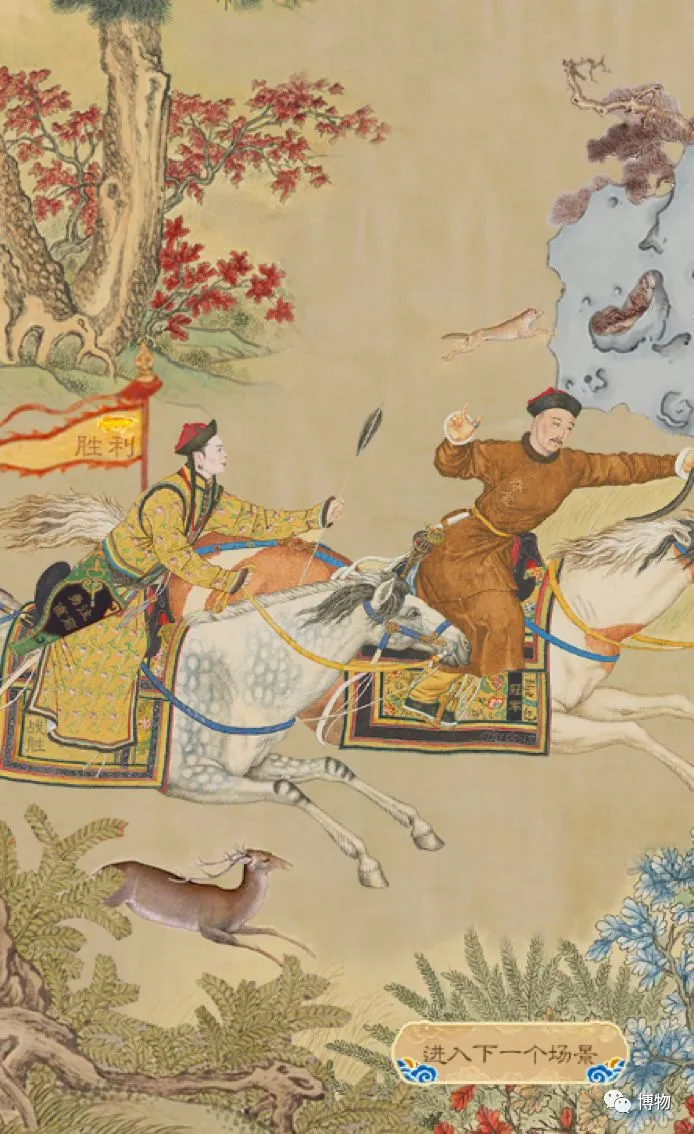 比如这是象征事业的“狩猎图”,清代皇帝个个好身手,英雄得鹿,文治武功。旗子上的胜利二字特别显眼,这当然也是关键字啦。
