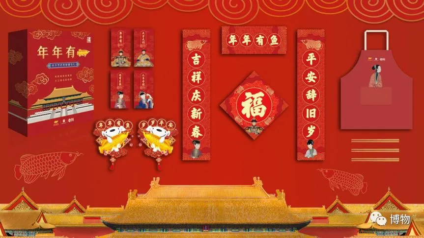 还有故宫宫廷文化携手金龙鱼推出的#年年有鱼#新春限量文创礼盒,内有利是封、对联、四字横批、门贴、围裙、筷子等等。送礼有面,自用有福。