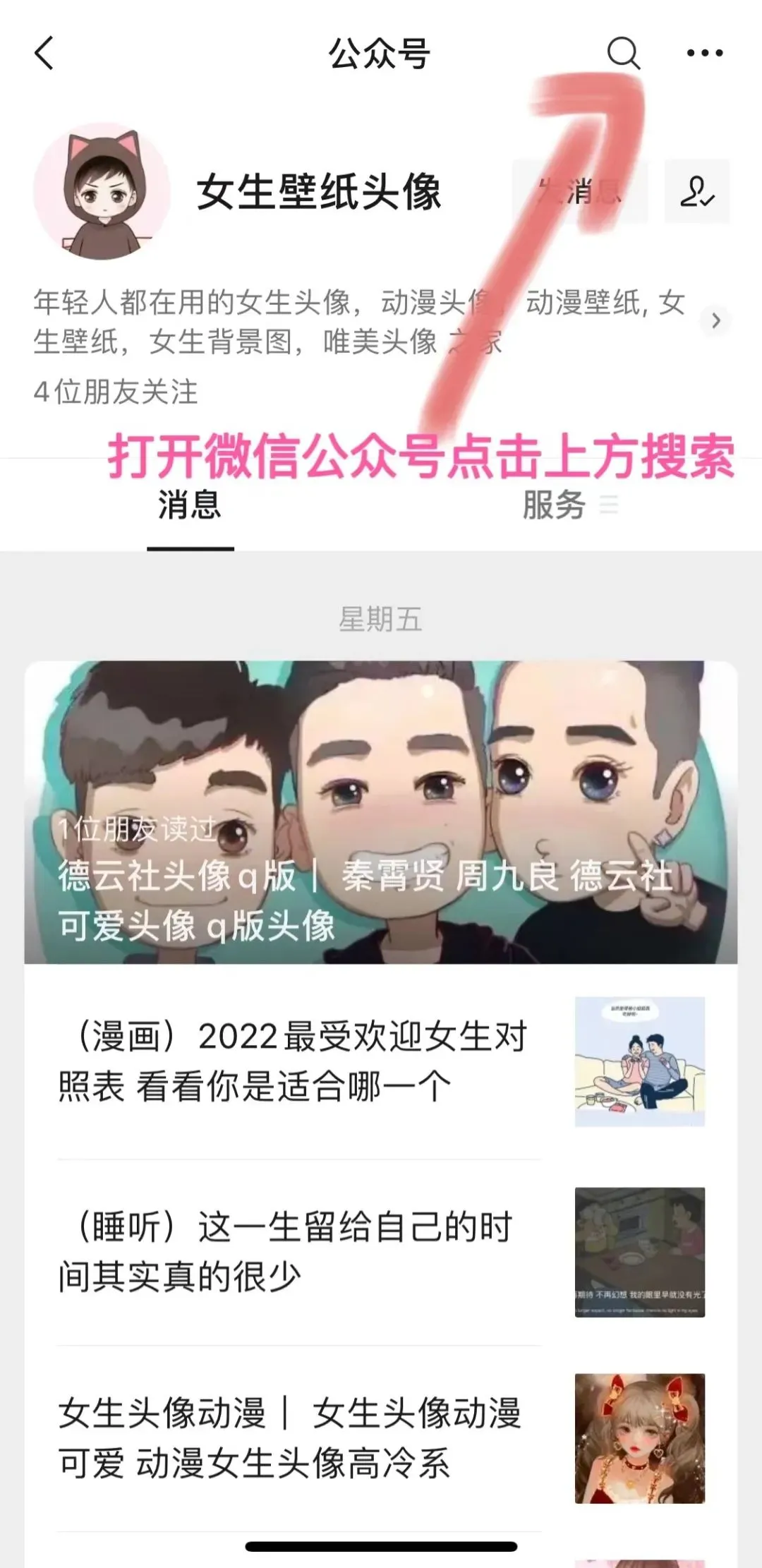 打开微信公众号  可以点击右上方 哪个搜索功能  搜索 你想要的头像,或者点击微信公众号聊天框,选择