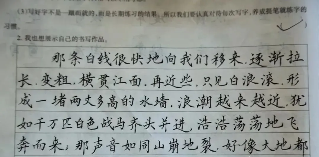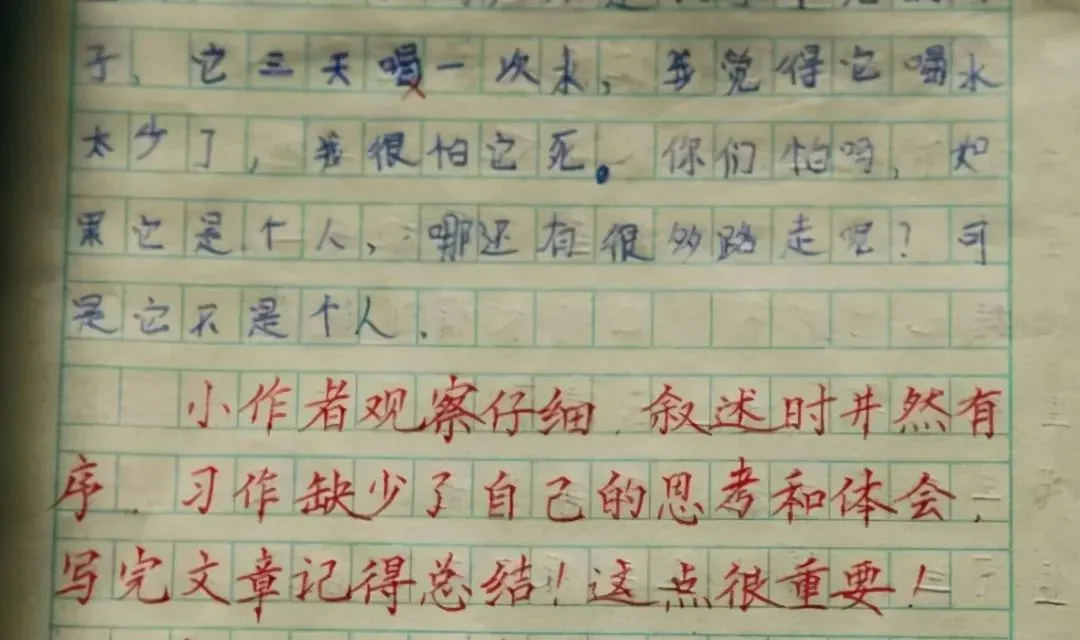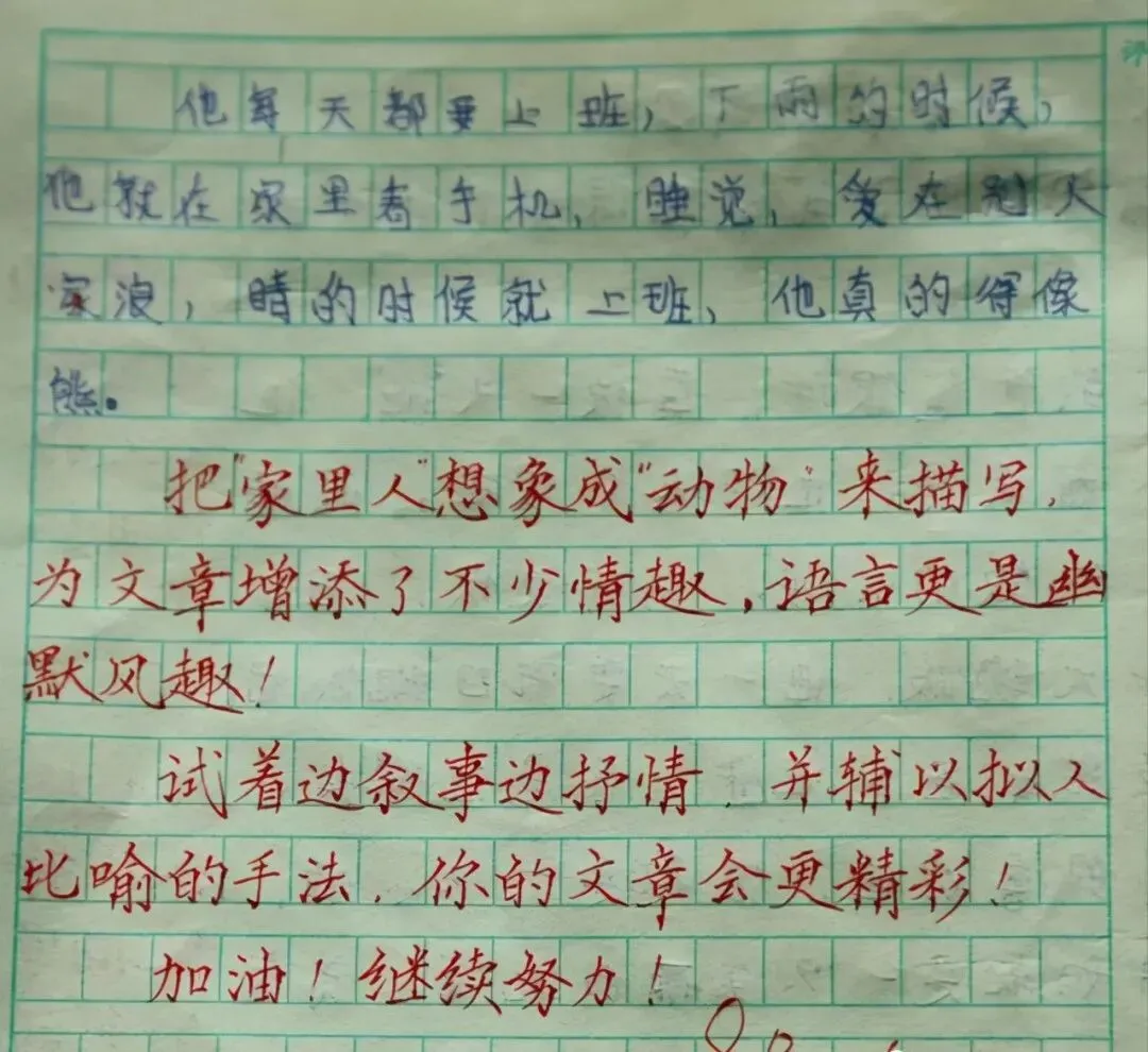 教师,不仅是一项良心职业,而且还是一项责任职业,除了日常的备课上课之外,还有日常检查,还有作业批改,提到作业批改,对于很多老师来说,也是一项繁重的体力活,不仅要找到学生作业书写上的错误,还要记录学生的错误之处,以待下次上课的时候就要进行作业反馈,让学生能够清楚自己错误的地方,以及错误的原因,还有的老师要在学生作业上写出评语,甚至是一段鼓励的话语,而这位小学女教师就是这样的一位老师,她在学生作文上留下了自己的批改字迹,这种手写的字迹,让学生很是惊讶,整体上给人一种很惊艳的感觉,不仅工整美观,而且还写出了“书法范”,比“印刷体”还要耐看,下面就让我们一同欣赏一番吧。