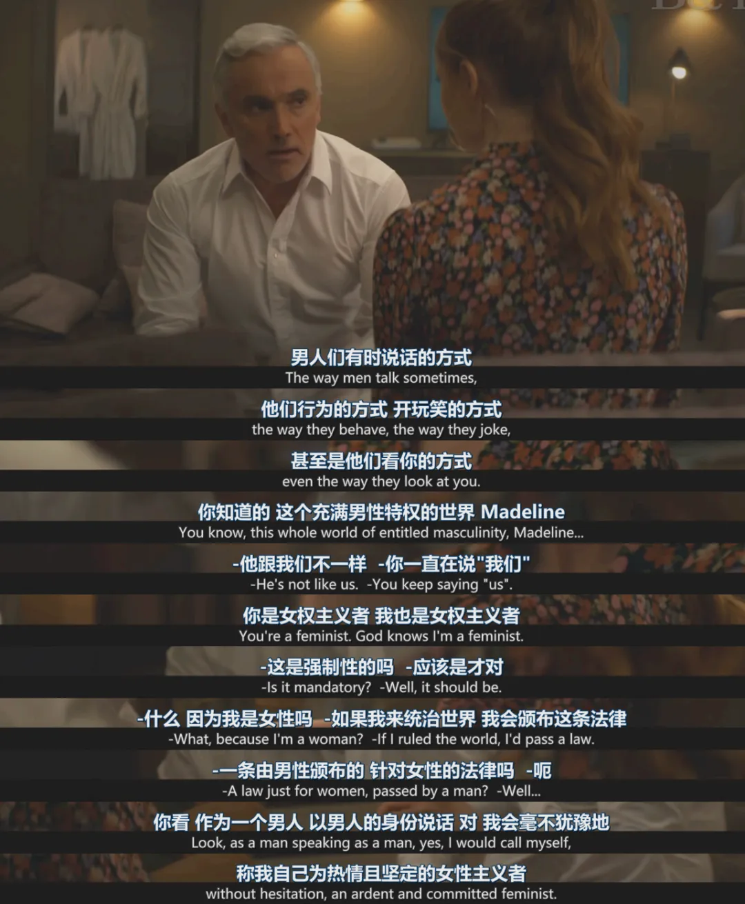 所以我认为这部剧不仅是在抨击父权社会下的男性同盟,更是Douglas作为Madeline从小到大最为尊敬、最仰慕,换言之是她心中最接近完美的那个男人,却也是这一制度的同伙、共谋,也是在父权制下的大多数,完美形象彻底幻灭。